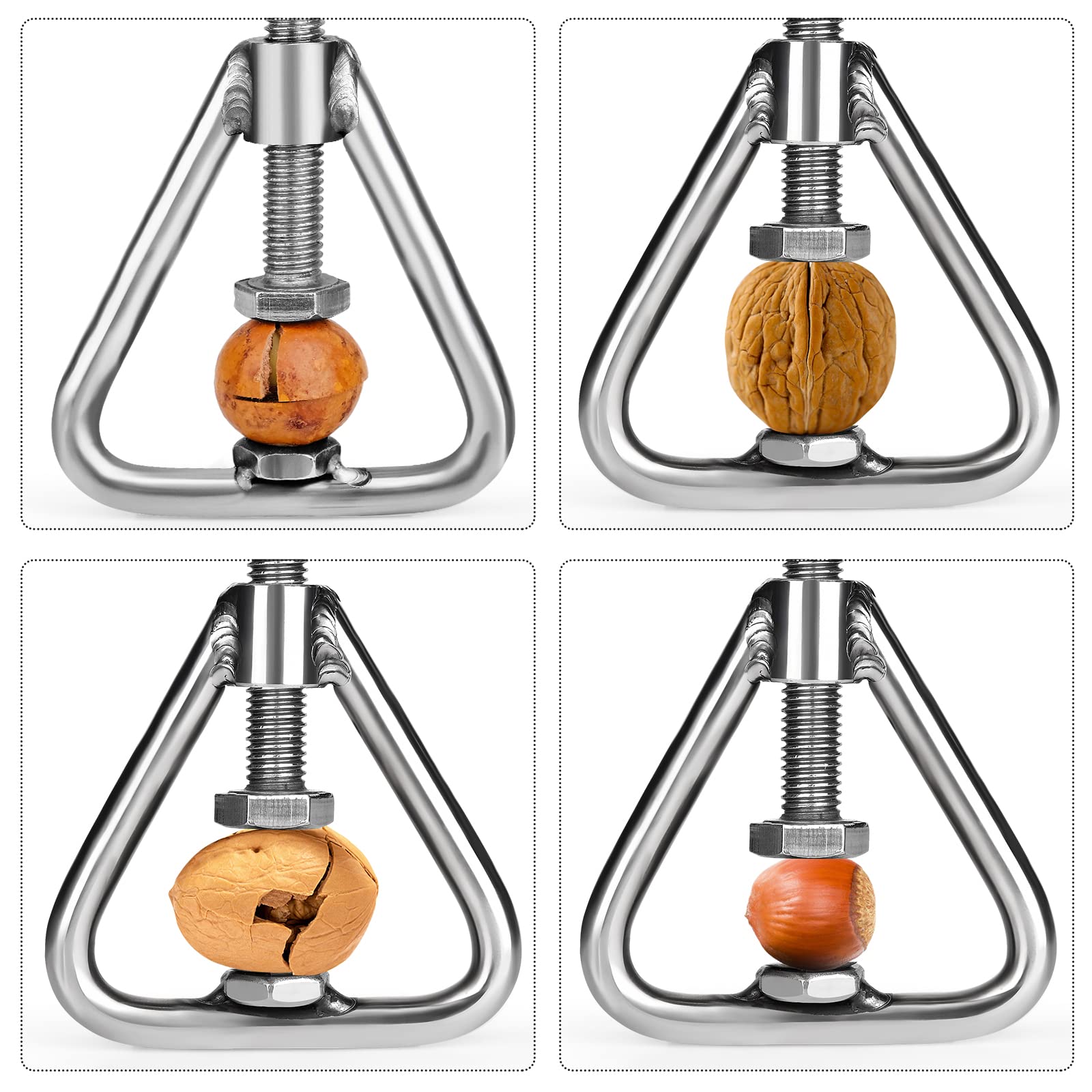 Boah, dieser Nussknacker ist einfach genial! Endlich mal ein Teil, das wirklich funktioniert ohne dass dir die Nusskrümel überall rumfliegen. Aus massivem Edelstahl gemacht - rostfrei, leicht zu reinigen und einfach unkaputtbar. Mit 174 Gramm hat er genau das richtige Gewicht, um stabil in der Hand zu liegen.\n\nDas dreieckige Design ist richtig clever: Du setzt die Nuss einfach in die Spitze, drehst leicht und zack - die Schale bricht sauber auf, ohne dass der Kern zermatscht. Bei 9x8,8 cm ist er genau die richtige Größe für deine Küchenschublade.\n\nOb Walnüsse, Pekannüsse, Haselnüsse oder sogar diese hartnäckigen Macadamianüsse - dieses Teil macht mit allen kurzen Prozess. Der ergonomische Griff liegt super in der Hand, selbst wenn du ne ganze Schüssel Nüsse knacken willst, werden deine Hände nicht müde.\n\nPerfekt für die Weihnachtsbäckerei, als Geschenk für Nuss-Liebhaber oder einfach für alle, die keine Lust mehr auf diese fummeligen Nussknacker haben, bei denen man sich fast die Finger klemmt. Einfach, effektiv und macht einfach Spaß! Endlich stressfreies Nüsseknacken! 🥜💥