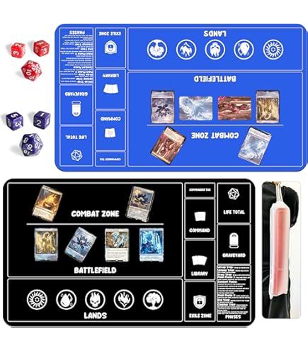 Professionell Magic spielen! Diese coole MTG-Spielmatte mit vorgezeichneten Zonen macht das Spielen viel übersichtlicher. Mit 61x35,6cm bietet sie genug Platz für dein Commander-Deck, Würfel und alles andere was du brauchst. Die Oberseite aus weichem Polyester schützt deine wertvollen Karten vor Beschädigungen, die rutschfeste Gummi-Unterseite hält die Matte sicher an Ort und Stelle. Die hochwertig genähten Kanten verhindern Ausfrasen - hält also auch bei intensivem Gebrauch. Das süße Feenwald-Pilz-Design sieht nicht nur gut aus, es inspiriert auch zu neuen Strategien! Perfekt für Turniere, Spieleabende oder einfach zum Üben. Leicht zusammenrollbar und überall mitnehmbar. Auch super als übergroßes Mauspad fürs Gaming-Setup! Ein tolles Geschenk für jeden Magic-Spieler - ob Anfänger oder Profi.
