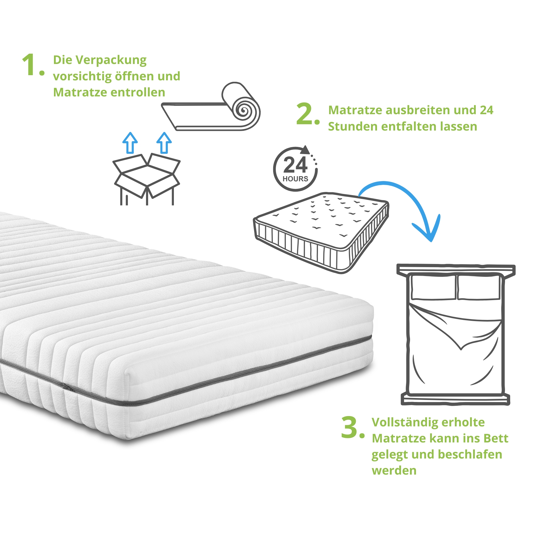 Richtig gut schlafen mit dieser Bodyprotect Matratze! 100x200cm groß, 24cm hoch mit 7-Zonen-Kern für optimale Körperanpassung. Härtegrad H2 (weich bis mittelfest) - perfekt für die meisten Schläfer. Aus hochwertigem Kaltschaum mit hoher Punktelastizität. Der Bezug aus 65% Polyester, 35% Viskose ist atmungsaktiv und bei 60°C waschbar. Öko-Tex zertifiziert und made in EU - Qualität, die man spürt. Als Rollmatratze geliefert, also einfach auspacken und sie entfaltet sich von alleine. Mit 4 Wendegriffen für easy Handling. Egal ob Rücken-, Bauch- oder Seitenschläfer - hier findest du deine perfekte Schlafposition!