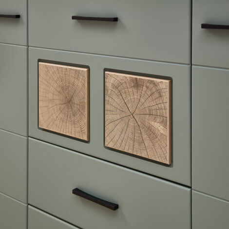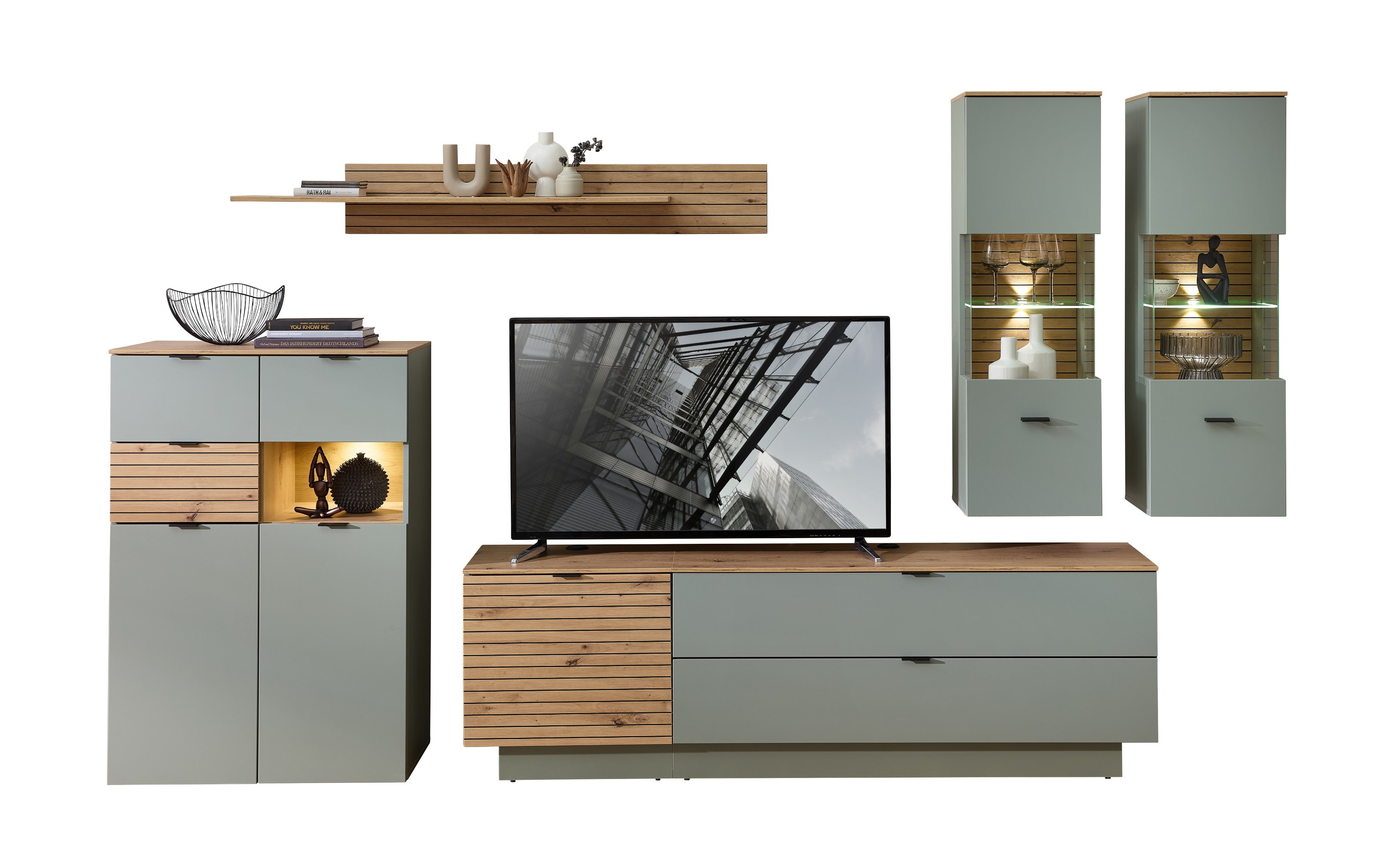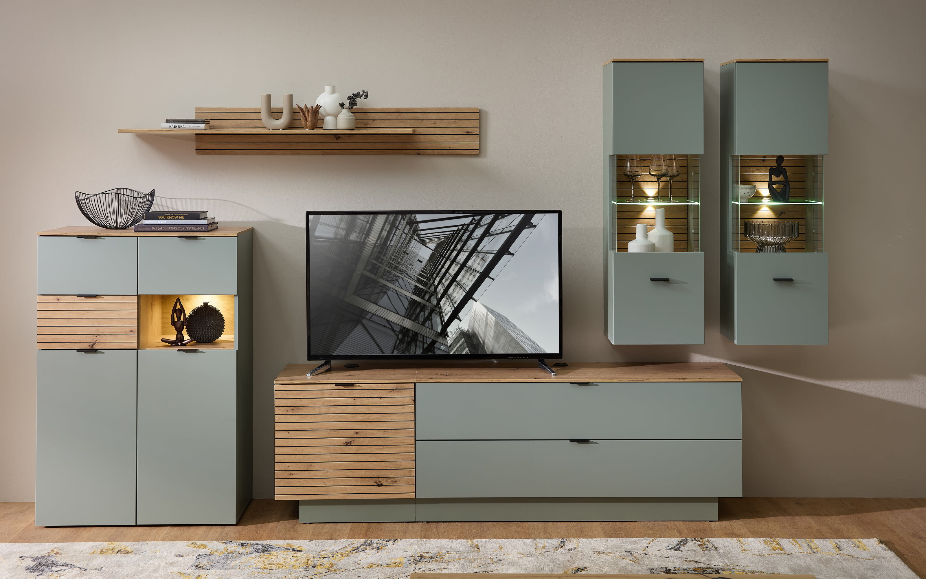 Wow, diese Wohnwand verwandelt dein Wohnzimmer! Das 5-teilige Set in trendigem Eiche-Decor mit schilfgrünen Fronten sieht einfach mega aus. Enthalten sind: 1 Highboard (80x139x37 cm), 1 Vitrine (65x205x37 cm), 1 Lowboard (140x51x47 cm) und 1 Wandboard (180x18x22 cm). Gesamtmaß stolze 325x205x47 cm - genug Stauraum für alles! Besonders cool: Integrierte LED-Beleuchtung in Highboard und Vitrine sorgt für gemütliches Ambiente. Die Türen haben Softclose-Funktion, Schubladen schließen selbständig. Aus hochwertigen Materialien: Korpus aus Melaminharz-beschichteten Spanplatten, Fronten aus tiefgezogenem MDF. Lieferung erfolgt zerlegt zur Selbstmontage - aber keine Sorge, mit bebilderter Anleitung geht's easy! Wird von 2 Personen frei Bordsteinkante geliefert. Modern, funktional und absolut stylisch - damit wird dein Wohnzimmer zum echten Hingucker!