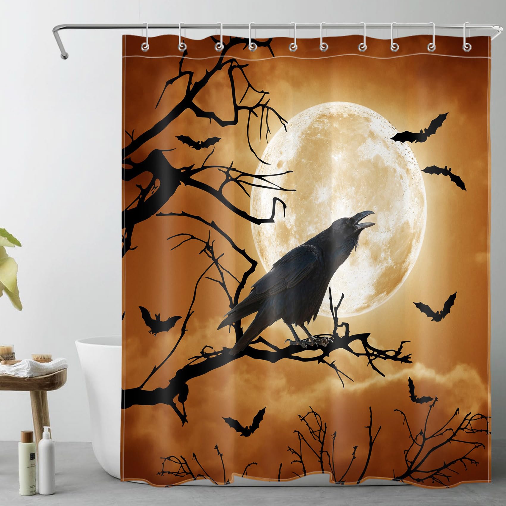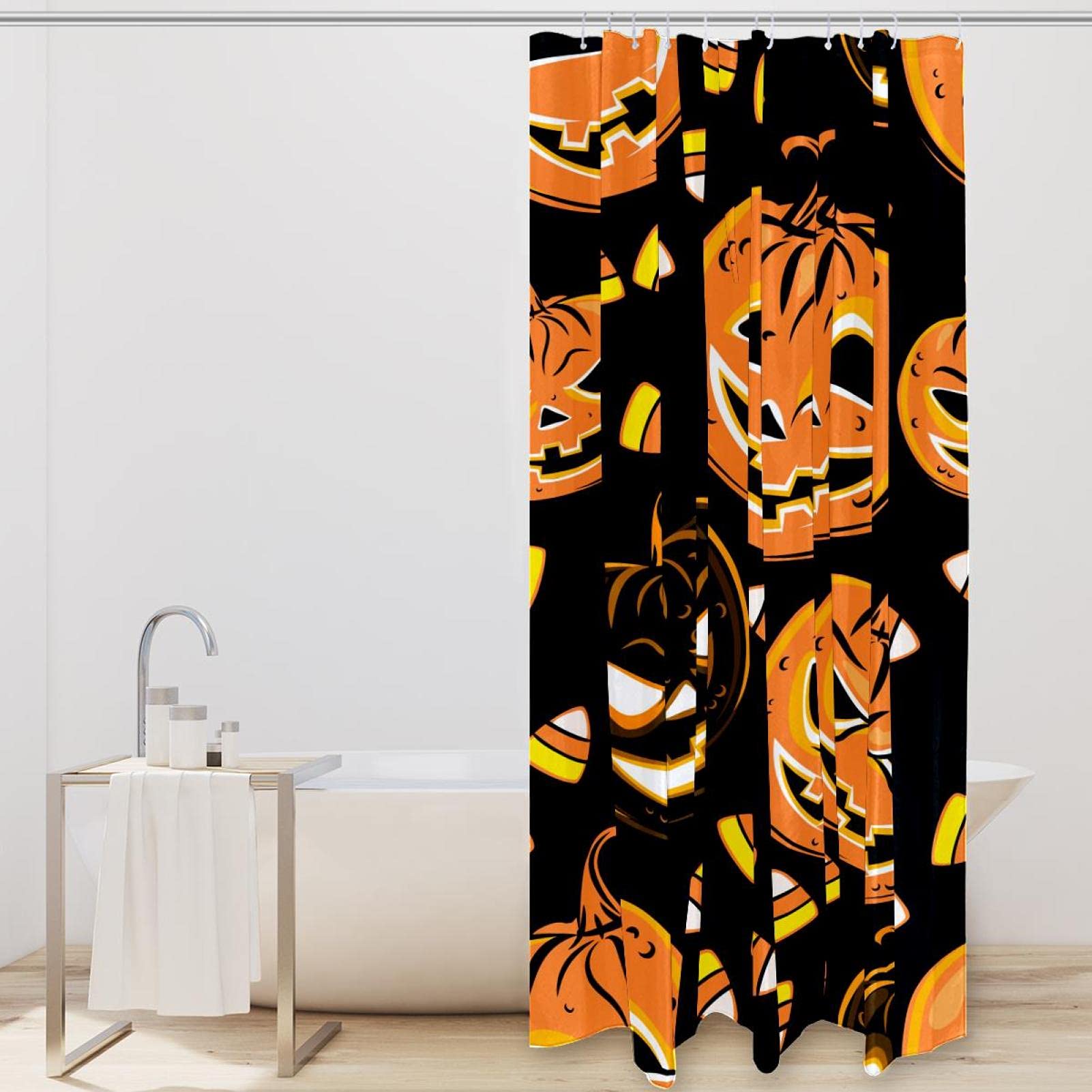 Mach dein Badezimmer zur gruseligen Halloween-Partyzone! Dieser coole Duschvorhang zeigt einen riesigen orangenen Mond, fliegende Fledermäuse, grinsende Kürbisse und eine unheimliche Burg - perfekt für die Halloween-Zeit. Aus 100% Polyester gefertigt, ist er wasserdicht, geruchlos und super langlebig. Mit den Maßen 183x183 cm passt er in fast jedes Badezimmer. Aber er kann mehr als nur duschen - nutz ihn auch als Raumteiler, Fenstervorhang oder als coole Kulisse für deine Halloween-Fotos. Das Set enthält 12 robuste Metallösen und 12 Kunststoffhaken für einfache Montage. Einfach aufhängen und schon ist die Stimmung da! Pflege ist auch kein Problem - einfach in der Maschine bei kaltem Wasser waschen (Schonprogramm) und bei Bedarf bei niedriger Temperatur bügeln. Ob für die Wohnung, im Studentenwohnheim oder Hotel - dieser Duschvorhang bringt sofort Halloween-Feeling in dein Zuhause. Perfect für alle, die es gruselig mögen!