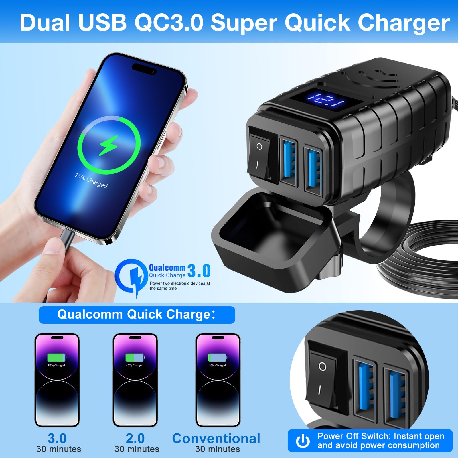 Alter, diese USB-Ladebuchse fürs Motorrad ist genial! Mit satten 54W Gesamtleistung - da laden selbst Tablets und Navis super schnell. USB-C mit Power Delivery (36W) und USB-A mit Quick Charge 3.0 (18W) - für alle Geräte optimal. Das integrierte LED-Display zeigt dir immer die Batteriespannung an, damit du nie liegen bleibst. IPX4 spritzwassergeschützt - egal ob Regen oder Spritzwasser. Zwei Montagemöglichkeiten: Am Lenker oder an der Rückspiegelhalterung. Mit praktischem Ein/Aus-Schalter unter der Abdeckkappe. Für 12-24V Systeme geeignet - passt also zu Motorrad, ATV, Trike und mehr. Einfach installieren und nie wieder mit leerem Akku stranden. Absolute Empfehlung für alle Biker!