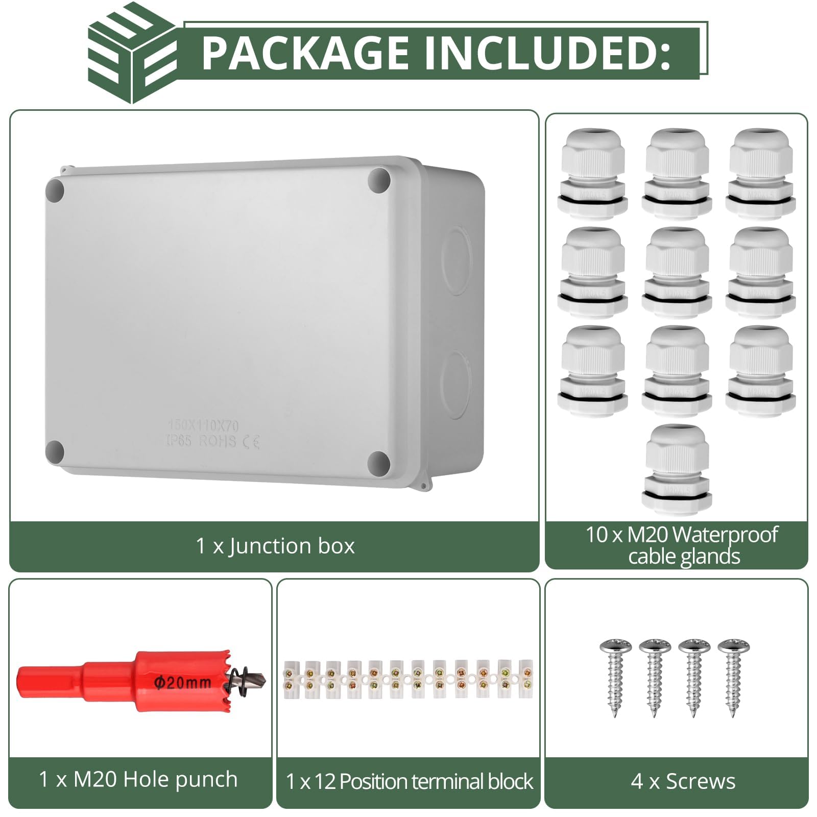 Für alle Elektro-Projekte drinnen und draußen ist diese wasserdichte Verteilerdose genau das Richtige! Mit IP65-Schutzklasse hält sie nicht nur Spritzwasser stand, sondern ist auch staubdicht - perfekt für den Einsatz im Garten, auf dem Balkon oder in der Garage. Die Maße von 150x110x70mm bieten genug Platz für mehrere Kabel und Verbindungen. Aus robustem ABS-Kunststoff gefertigt, der hitze- und kältebeständig ist und lange hält. Das Komplett-Set enthält wirklich alles, was ihr braucht: 10x M20 wasserdichte Kabelverschraubungen, Klemmenblöcke für 12 Anschlüsse, Edelstahlschrauben, einen Lochöffner und sogar einen Schraubendreher. Die Dose hat vorbereitete Anschlusspositionen - einfach mit dem beiliegenden Werkzeug die Löcher stanzen und die Kabelverschraubungen einsetzen. Für Kabel mit 6-12 mm Durchmesser geeignet. Ob für Beleuchtung im Garten, Steckdosen auf der Terrasse oder allgemeine Elektroinstallationen - mit dieser Dose seid ihr auf der sicheren Seite. Einfach zu installieren, langlebig und zuverlässig - was will man mehr?