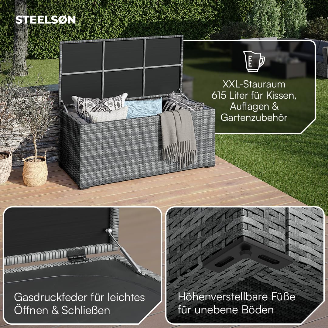 Endlich Ordnung im Garten! Diese mega-praktische Aufbewahrungsbox von STEELSN hat satte 560 Liter Fassungsvermögen - da passt alles rein: Sitzauflagen, Gartengeräte, Spielzeug, Decken und mehr. Aus robustem 0,8 mm starkem Stahl mit Pulverbeschichtung, absolut wetterfest gegen Regen, UV-Strahlung und Rost. Der Deckel hat zwei Gasdruckfedern, die das Öffnen superleicht machen - kein lästiges Zuknallen! Maße: 165x70x63cm (Außen), passt perfekt auf Terrasse, Balkon oder in den Garten. Sieht mit dem grauen, modernen Design auch noch richtig gut aus. Einfach aufbauen und jahrelang Freude daran haben!