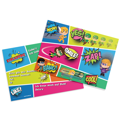 Die Designs sind richtig dynamisch und farbenfroh - genau das, was Kinder lieben! Jedes Kind fühlt sich wie ein kleiner Superheld, wenn es diese Einladung bekommt.
