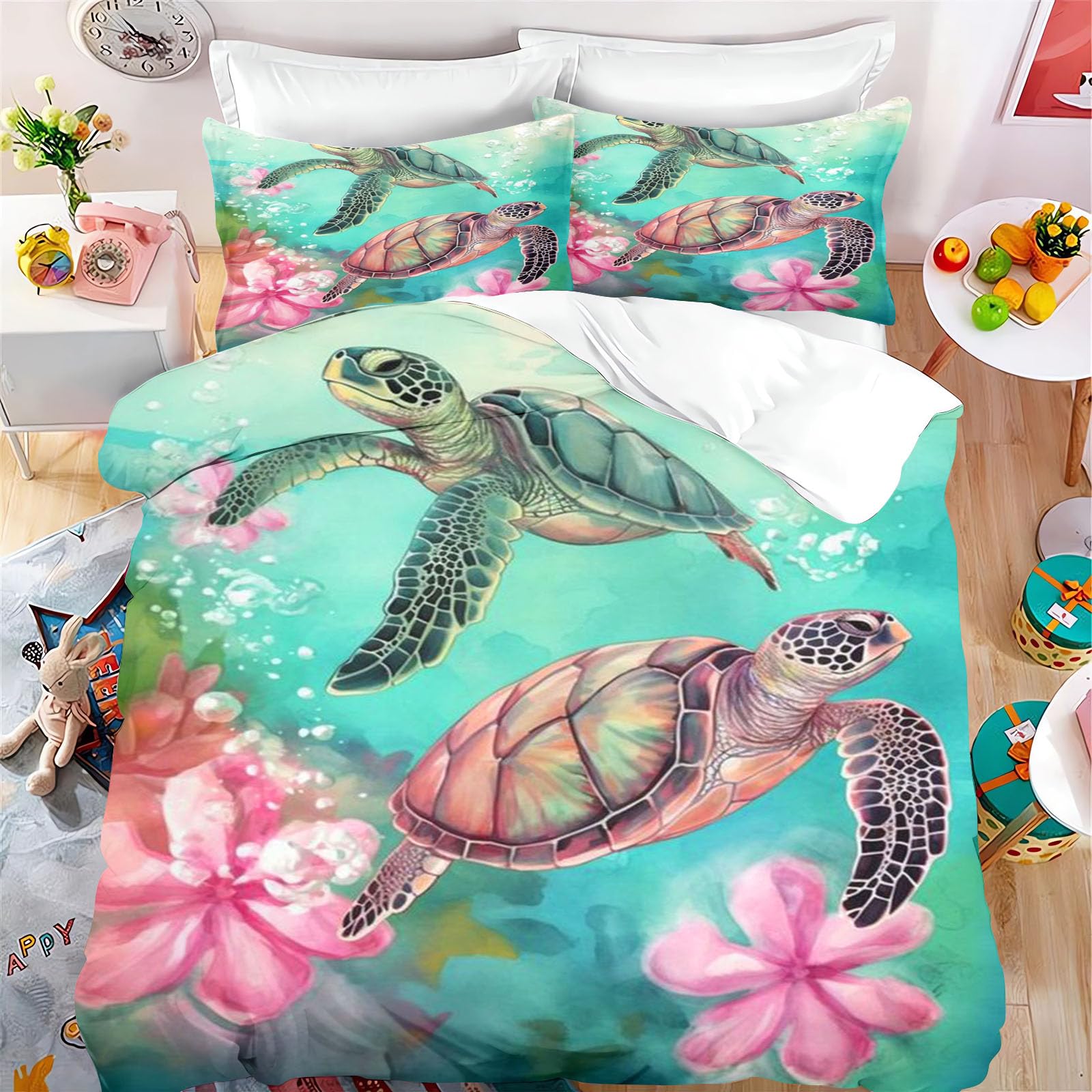 Träumst du von tropischen Stränden und bunten Korallenriffen? Dieses süße Schildkröten-Bettwäscheset bringt den Ozean direkt in dein Schlafzimmer! Aus 100% Bio-Baumwolle gefertigt, super weich und atmungsaktiv - viel angenehmer als langweilige Mikrofaser. Das Set gibt's in verschiedenen Größen, die kleine Variante hat 135x200cm Bettbezug plus 80x80cm Kissenbezug. Die lebendigen Farben werden durch reaktives Färben erzielt und verblassen nicht - auch nach häufigem Waschen. Praktischer Reißverschluss und Eckbänder machen das Beziehen zum Kinderspiel. Waschtipp: Am besten die Bezüge auf links drehen oder Wäschesäckchen nutzen. Kalt waschen, nicht bleichen, schonend trocknen. Perfekt für Kinder, Teens oder alle, die das Meer lieben. Macht sich auch super als Geschenk zu Geburtstagen, Weihnachten oder zum Einzug. Dein Schlafzimmer wird zur Unterwasserwelt - einfach reinschlüpfen und abtauchen!