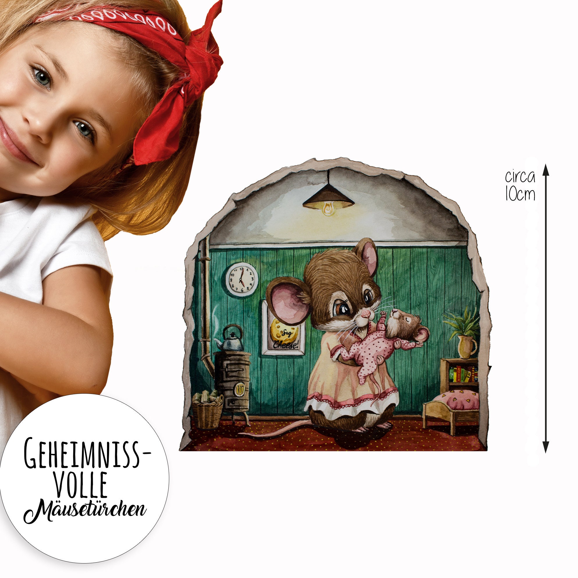 Huch, wer wohnt denn da? Dieses süße Mäusetürchen weckt die Fantasie deiner Kinder und verwandelt jede Ecke in eine Zauberwelt!\\n\\nDETAILS:\\n• Maße: 10cm hoch x 12,6cm breit\\n• Motiv: Mausetür mit Käse\\n• Made in Germany\\n• Wiederverwendbar\\n\\EIGENSCHAFTEN:\\n• Einfache Montage mit Anleitung\\n• Rückstandslos entfernbar\\n• Für Raufaser, Tapete, Glas, Fliesen\\n• 100% raufasertauglich\\n\\Perfekt für Kinderzimmer, Wohnzimmer oder Flur. Erzählt gemeinsam Geschichten über die kleine Maus, die da eingezogen ist. Fördert die Kreativität und macht einfach riesig Spaß!