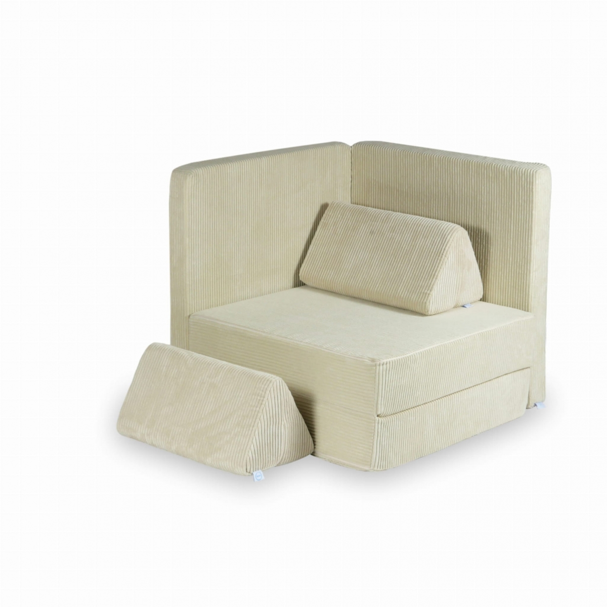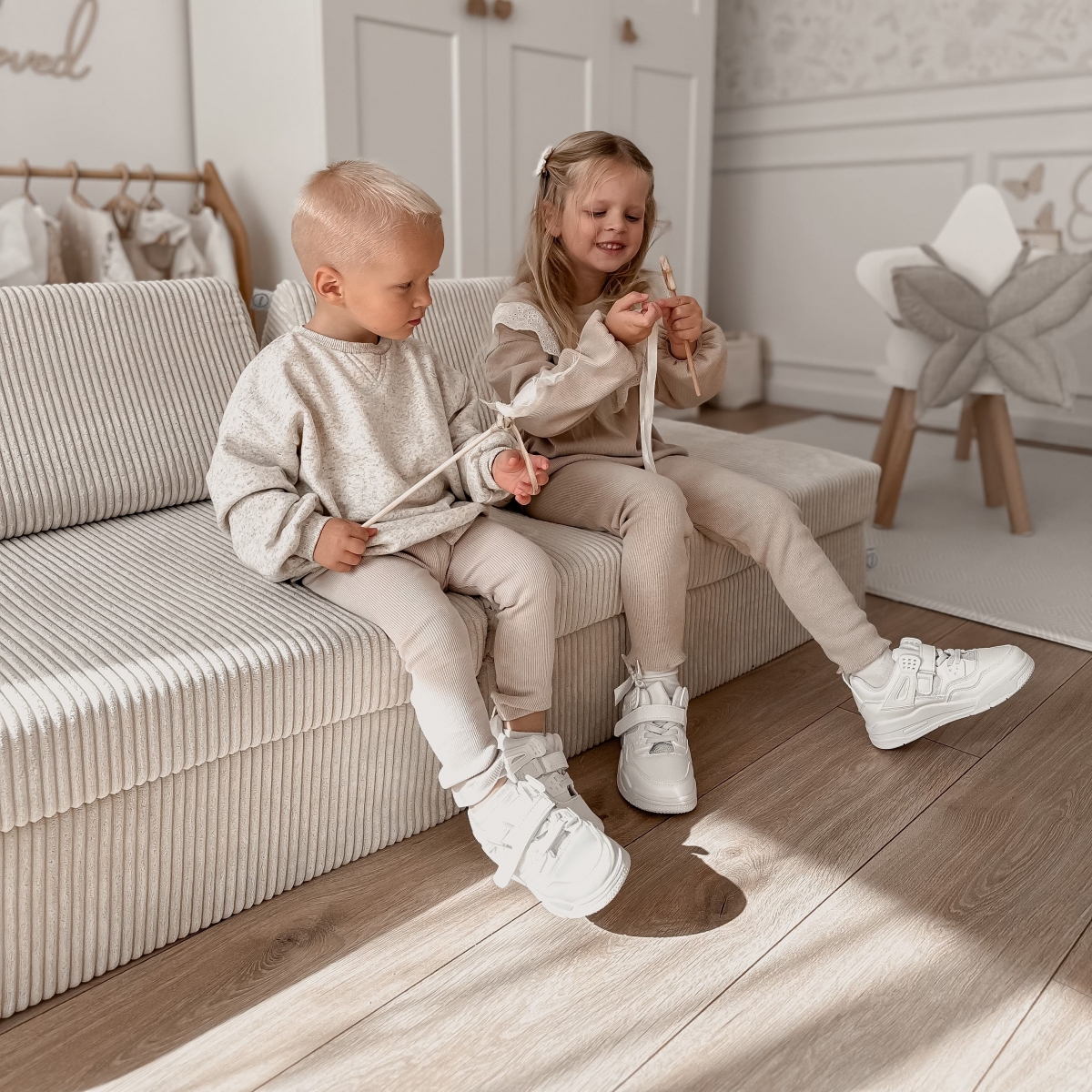 Das Spielsofa, das mitwächst! LIV verwandelt sich von gemütlicher Sitzgruppe zur actionreichen Rutsche oder Kletterlandschaft - je nach Laune deines Kindes. Mit 5 Stapelsteinen, die im praktischen Aufbewahrungsbeutel (auch als Hocker nutzbar) kommen. Versteckte Reißverschlüsse und wasserabweisende Bezüge sorgen für Sicherheit, während der weiche Cordstoff (100% Polyester) bei 30°C waschbar ist. Designed in Deutschland mit Fokus auf Langlebigkeit und Stabilität. Maße 140x70x53cm - perfekt für Kinder ab 18 Monaten. Ob im Kinderzimmer oder Wohnzimmer, das neutrale Beige passt überall hin. Förder Kreativität und Bewegungsdrang gleichzeitig - Spielspaß ohne Ende!