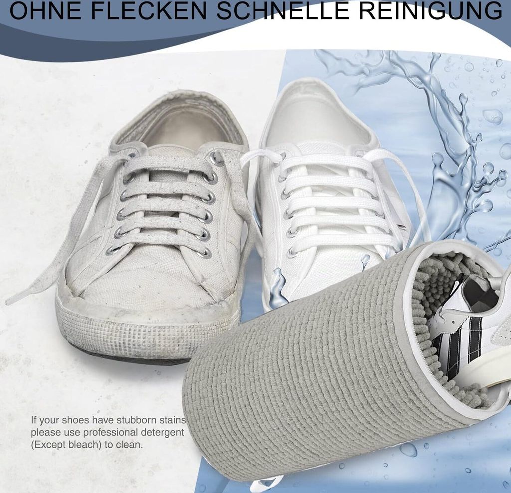 Endlich saubere Sneaker ohne Aufwand! Diese cleveren Schuhwaschbeutel machen das Reinigen deiner Lieblingsschuhe zum Kinderspiel. Einfach die Schuhe in den Beutel stecken, in die Waschmaschine geben und waschen - die integrierten Mikrofaser-Reinigungsfasern sorgen für eine 360°-Reinigung, während der Beutel deine Schuhe und die Waschmaschine schützt. Die robusten Netzbeutel (Ø 19 x 39 cm) passen für alle gängigen Schuhgrößen und sorgen für optimale Wasserzirkulation. Nie wieder verhedderte Schnürsenkel oder beschädigte Trommeln! Deine Turnschuhe kommen strahlend sauber und hygienisch frisch aus der Maschine, ohne dass du sie von Hand schrubben musst. Perfekt für Sportschuhe, Sneaker oder Alltagsschuhe, die regelmäßig gereinigt werden müssen. Das 2er-Set ist praktisch, wenn du mehrere Paare gleichzeitig waschen willst oder Ersatz brauchst. Schont nicht nur deine Schuhe, sondern auch deine Waschmaschine. Einfach benutzen, waschen, trocknen lassen - und sich über saubere Schuhe freuen! Der Game-Changer für alle, die ihre Sneaker lieben.