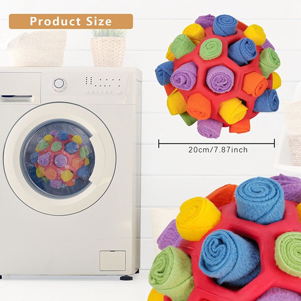 Mega Idee gegen Langeweile bei deinem Hund! Dieser Schnüffelball aus weichem Filz-Stoff ist perfekt für kleine und mittlere Hunde. Einfach Leckerlis in die vielen Löcher stopfen, dann muss dein Vierbeiner sich das Futter erarbeiten. Fördert den natürlichen Jagdinstinkt und beschäftigt deinen Hund sinnvoll. Super gegen Langeweile, Trennungsangst oder zum Training. Der Filz ist super sanft zum Fell und geruchsneutral. Maße: 20cm Durchmesser. Einfach zu reinigen - kann in die Waschmaschine! Wichtig: Immer beaufsichtigen, kein Spielzeug ist unzerstörbar. Dein Hund wird's lieben - versprochen! Macht auch müde Hunde glücklich.