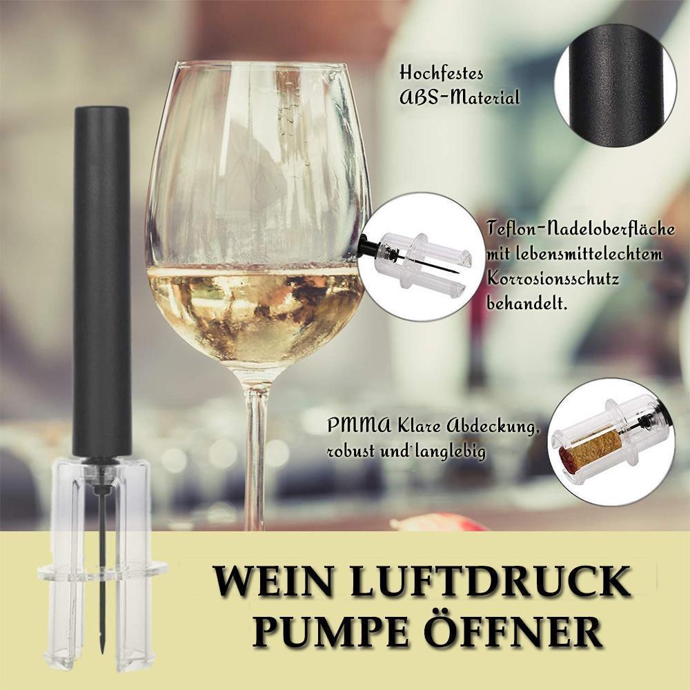 Wein öffnen mal anders! Dieser geniale Luftdruck-Öffner macht das Entkorken zum Kinderspiel. Einfach die Nadel durch den Korken stechen, mit der Pumpe Luft in die Flasche drücken - und schon schiebt der Luftdruck den Korken sanft heraus. Ohne Zerren, ohne Bruch! Der integrierte Folienschneider entfernt mühelos die Alufolie. Aus Edelstahl und ABS gefertigt, ist der Öffner langlebig und sieht dabei richtig stylisch aus. Mit 202mm Länge perfekt in der Hand liegend. Die Sicherheitsvorrichtung verhindert ein Zerplatzen der Flasche bei zu hohem Druck. Super für Weinliebhaber, die Wert auf intakte Korken legen. Einfach, clever und absolut effektiv - probier es aus!