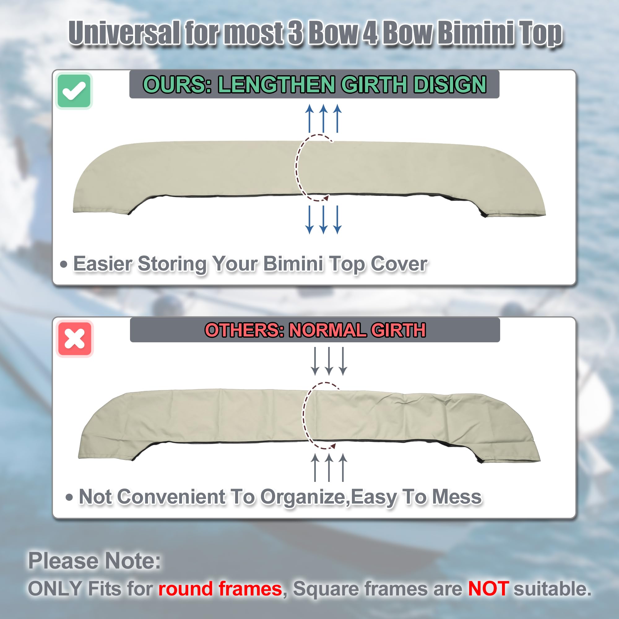 Das coole Feature: Die integrierte Lichtöffnung mit Reißverschluss oben sorgt für einfache Handhabung. Das verstellbare Zugband garantiert einen festen Sitz auf deinem klappbaren Bimini Top. Und weil wir 1,2 Zoll extra Umfang hinzugefügt haben, passt sie super für die meisten 3- und 4-Bow Bimini Tops.