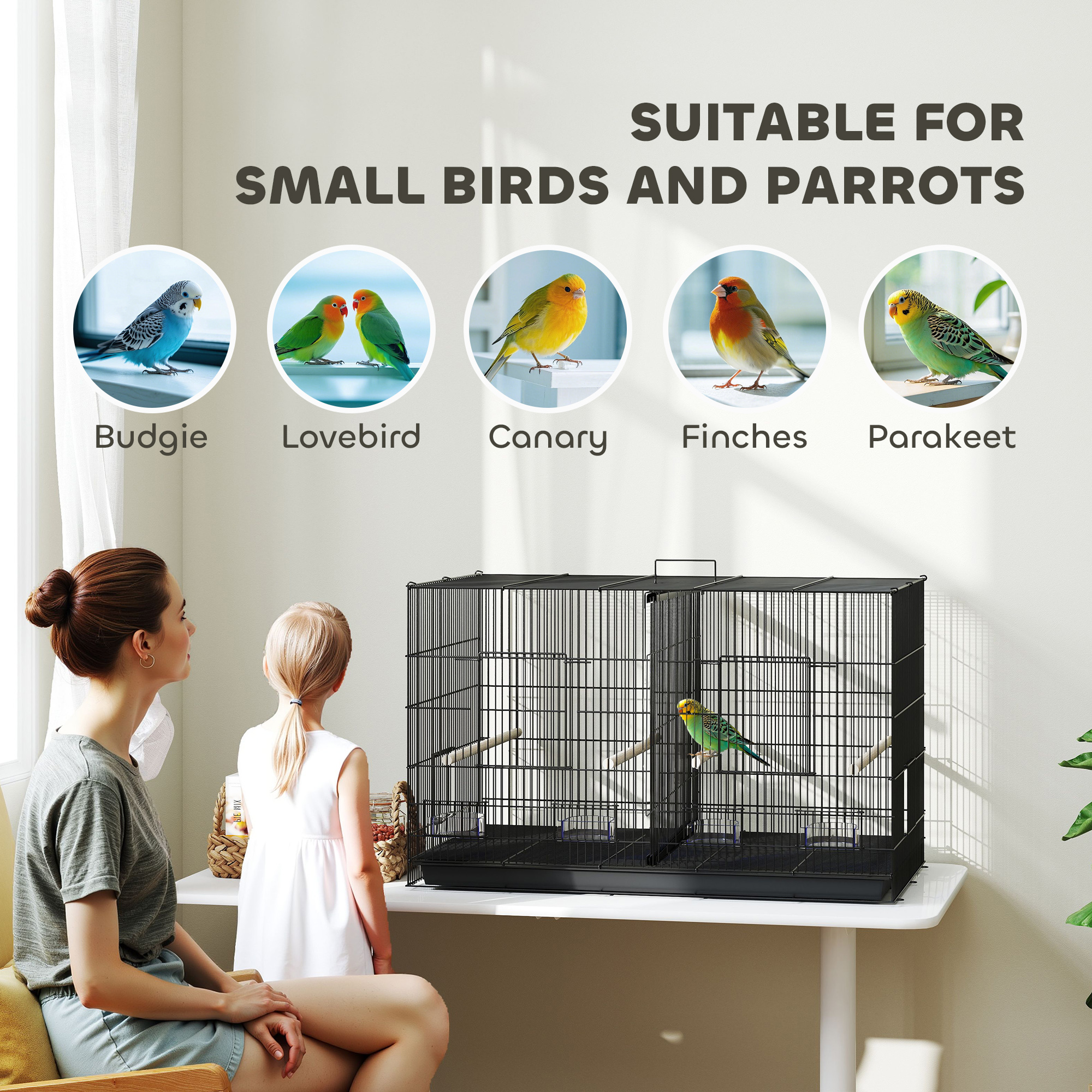 Riesiger Vogelkäfig von PawHut für deine gefiederten Freunde! Maße: 76x46x116 cm - plenty Platz zum Fliegen und Toben. Die verstellbare Trennwand ist das Highlight: Zwei separate Bereiche oder ein großer Raum - ganz wie du willst!