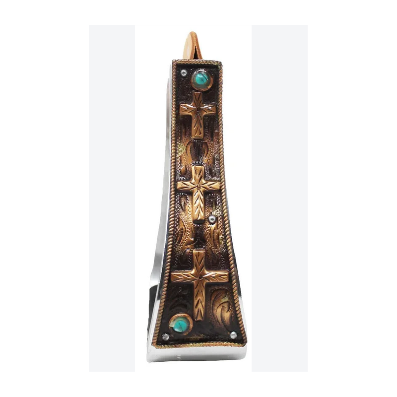 Die Steigbügel sind aus robustem Aluminium gefertigt und halten auch bei intensivem Trail-Reiten oder täglichem Gebrauch stand. Die schöne Gravur mit Kreuz-Motiv verleiht ihnen einen authentischen Western-Look.