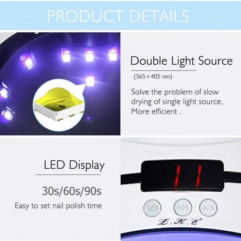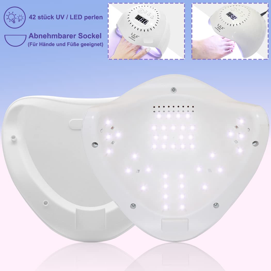 Professionelle Maniküre für zu Hause! Diese LKE UV-Lampe macht deine Gelnägel in Rekordzeit hart und glänzend. Mit 54W Leistung und 3 Timer-Einstellungen (99S für dünne Schichten, 60S für Standard, 30S für Topcoat) trocknet sie jeden Nagellack perfekt. Das coole Feature: Der IR-Sensor schaltet das Licht automatisch ein, sobald du deine Hand reinlegst - und wieder aus, wenn du sie rausnimmst. Kein Knopfdrücken mehr! Das klare LCD-Display zeigt die verbleibende Zeit an. Per USB aufladbar - einfach an Laptop, Powerbank oder Steckdosenadapter anschließen. Mit nur 200g Gewicht und den Maßen 19x13x8 cm passt sie in jede Handtasche. Seit 2014 vertrauen professionelle Nagelstudios und Beauty-Fans weltweit auf LKE Qualität. Inklusive 24-Stunden-Kundenservice. Hol dir den Salon-Look bequem von zu Hause aus!