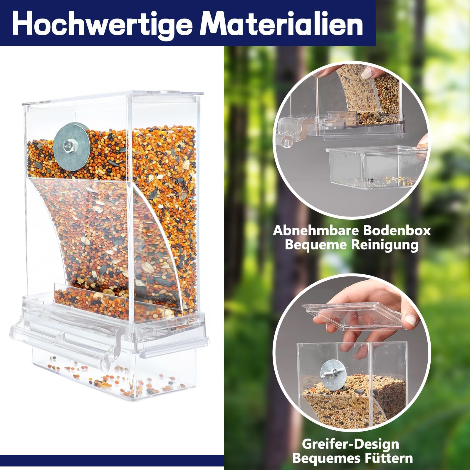 Deine Vögel werden es lieben! Ob Wellensittiche, Kanarienvögel, Nymphensittiche oder Finken - für alle ist dieser Futterspender geeignet. Wichtig: Nur für kleine bis mittlere Samen, große Körner könnten stecken bleiben. So sparst du dir nicht nur Zeit beim Saubermachen, sondern auch Geld für verschwendetes Futter. Deine Vögel haben immer frisches Futter zur Verfügung und du ein sauberes Zuhause!