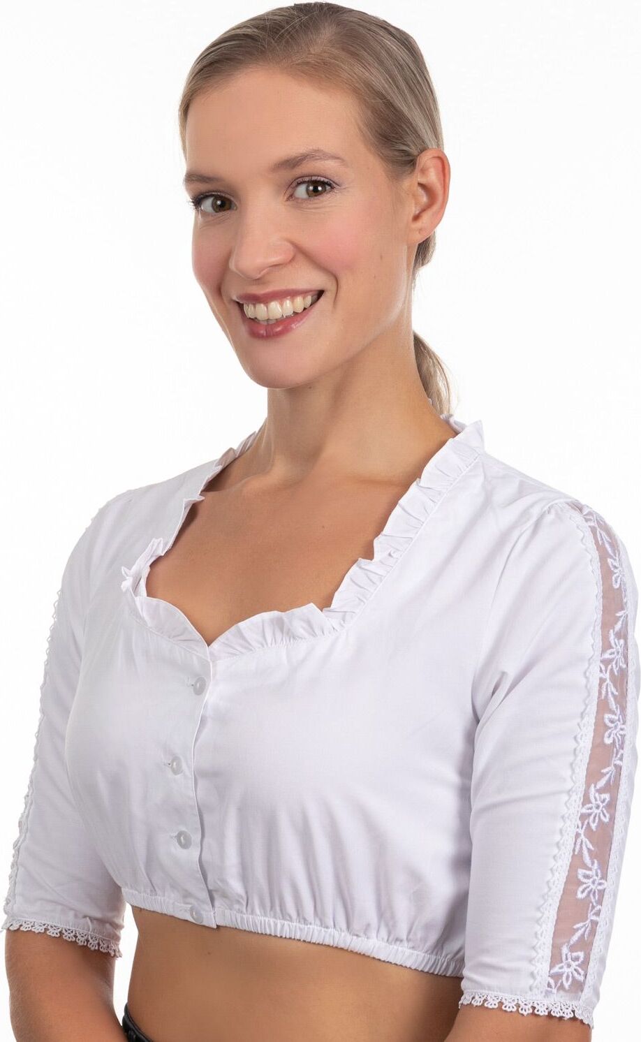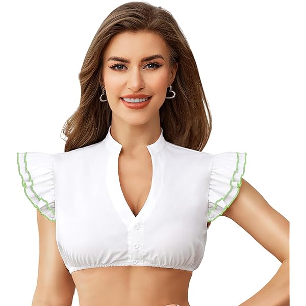Servus, Oktoberfest-Fans! Diese Dirndlbluse in reinem Weiß mit transparenten Details ist der absolute Hingucker für jedes Wiesn-Outfit. Die flatternden Flügelärmel sehen nicht nur super aus, sie geben dir auch maximale Bewegungsfreiheit zum Tanzen. Der V-Ausschnitt betont deine Figur perfekt, und der verstellbare Seidenbandgürtel sorgt für die optimale Passform. Aus hochwertigem Satin und transparentem Stoff gefertigt, fühlst du dich damit den ganzen Tag wohl. Ob mit Dirndl oder Rock - diese Bluse macht jede Tracht komplett. Die zarten Blattrüschen an den Ärmeln verleihen einen romantischen Touch, und die Verarbeitung ist einfach top. Perfekt nicht nur fürs Oktoberfest, sondern auch für andere Volksfeste, Hochzeiten oder Trachtenbälle. Mach dich bereit, alle Blicke auf dich zu ziehen! Einfach anziehen, den Gürtel anpassen und die Feste feiern, wie sie fallen.