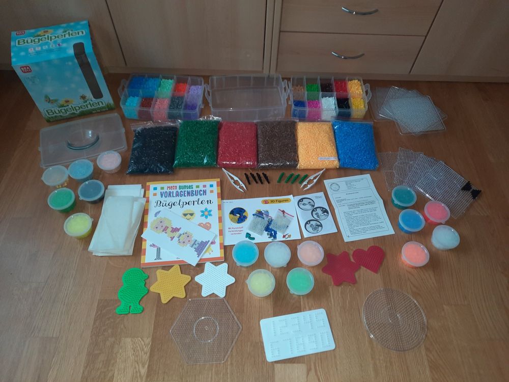 Hey, was für ein mega Bastelset! 1500 extra-große Bügelperlen in 12 verschiedenen Farben - alles in ner praktischen Aufbewahrungsbox. Perfekt für kleine Künstler ab 3 Jahren.\n\nDie Perlen sind ganze 10 mm groß - also super einfach für kleine Hände zu greifen und zu verarbeiten. Aus robustem EVA-Kunststoff, total kinderfreundlich und sicher. Ob gebügelt, aufgefädelt oder als Steckspiel - der Kreativität sind keine Grenzen gesetzt!\n\nDas Beste: Die Perlen passen zu Vorlagen aller Marken. So können die Kids ihrer Fantasie freien Lauf lassen. Und nebenbei fördert das Basteln Feinmotorik, Farbverständnis und Konzentration - ganz ohne Bildschirm!\n\nEin ideales Geschenk für Geburtstage oder einfach so. Mach deinen Kindern ne Freude und lass sie kreativ werden!