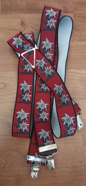 Richtig stylische Hosenträger mit coolen Edelweiss-Motiv! 35mm breit - schön auffällig aber nicht zu klobig. Mit praktischen Knopfloch-Verschlüssen - einfach an der Hose befestigen. Aus 81% Polyester und 19% Elastodien - dehnbar und bequem. Bis 120cm Länge - passt für Größen bis 190cm. Mit echten Lederpatten - sieht hochwertig aus. Perfekt für Trachten-Outfits, oder einfach um deiner Jeans mehr Style zu verleihen. Einfach anlegen und schon siehst du aus wie aus dem Mode-Katalog. Total vielseitig - zu Lederhose, Jeans oder sogar zur Anzughose. Macht jedes Outfit gleich viel interessanter!