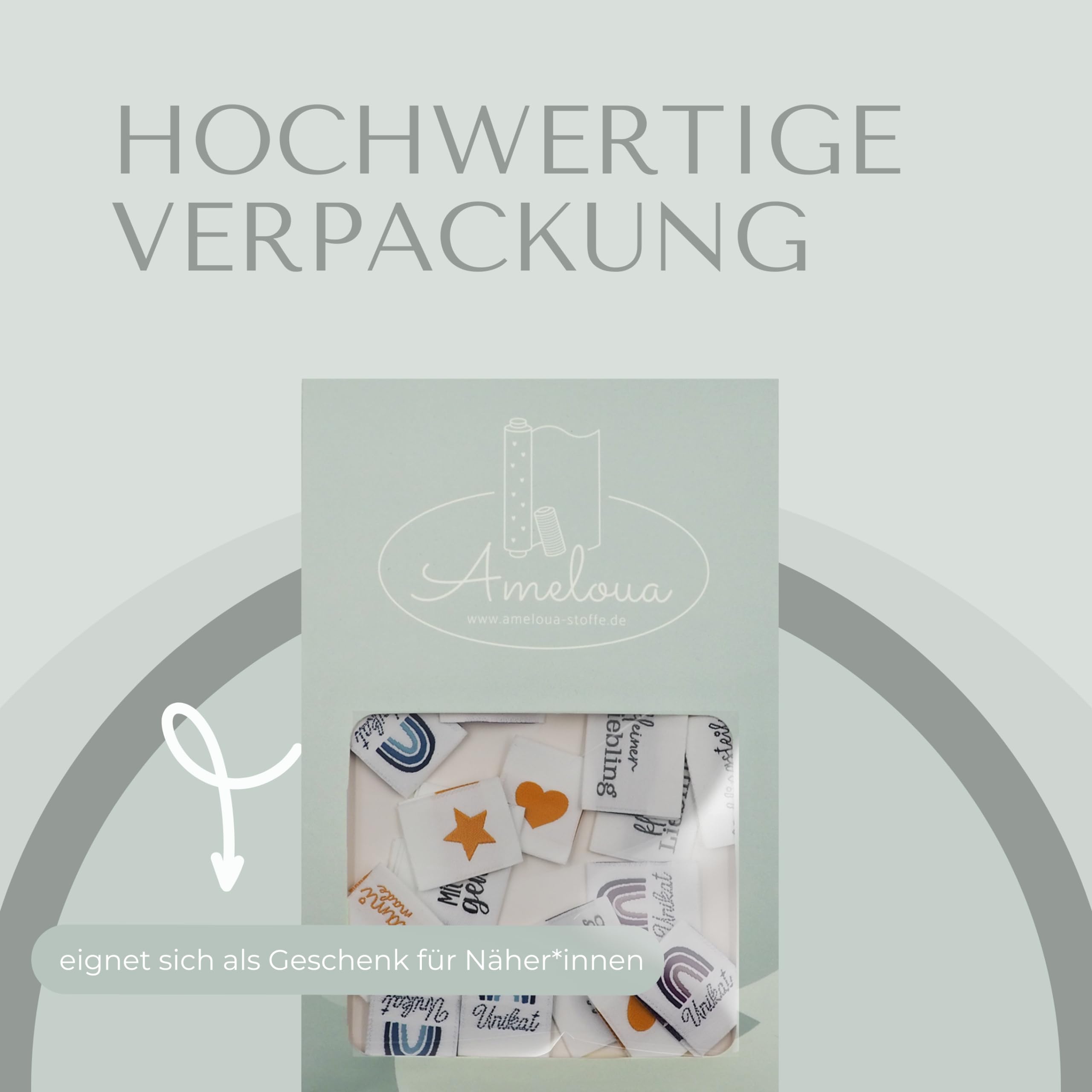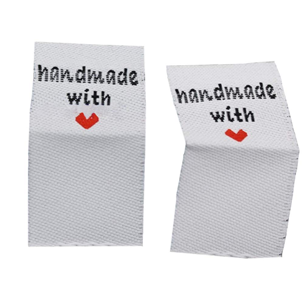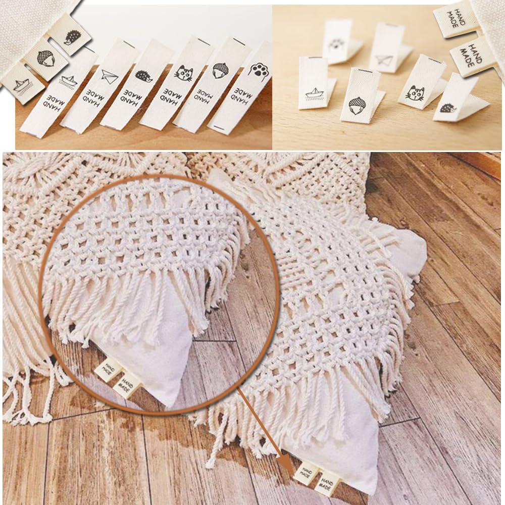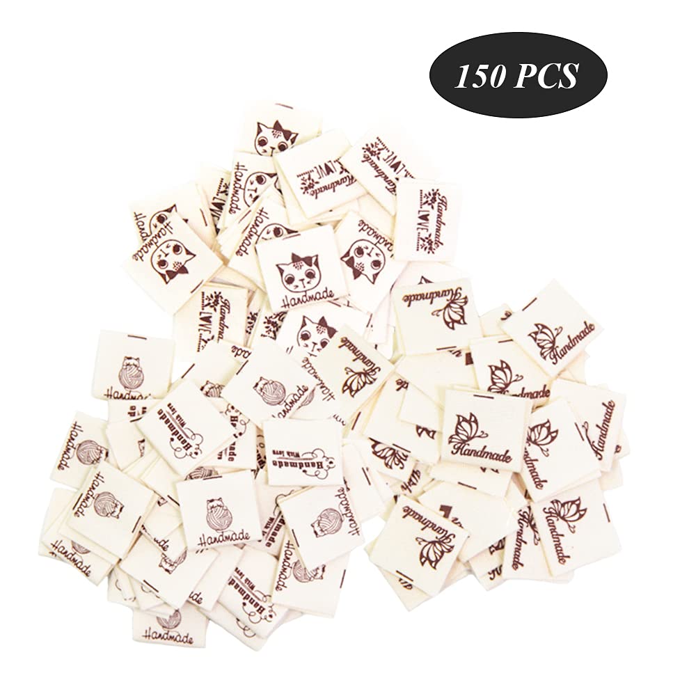 Diese Stoffetiketten sind genau das Richtige für alle, die selbstgenähte Kleidung oder Accessoires noch persönlicher machen wollen! Im Set sind 150 Etiketten in 5 verschiedenen niedlichen Designs enthalten - je 30 Stück mit Katzen, Schafen, Schmetterlingen, Wolle und Rattan-Mustern.\\n\\nAus weicher Baumwolle gefertigt, fühlen sich die Etiketten angenehm auf der Haut an und sind langlebig. Ungefaltet messen sie 2x4cm, gefaltet 2x2cm - also die perfekte Größe für die meisten Nähprojekte.\\n\\nEinfach in den Saum oder die Naht einnähen und schon sieht deine Handarbeit noch professioneller aus. Mit Aufschriften wie \handmade with heart\ oder \handmade with love\ zeigst du, dass da Liebe zum Detail drinsteckt.\\n\\nPerfekt für selbstgenähte Kleidung, Taschen, Kissen, Babykleidung oder Geschenke. Ob für dich selbst oder als Geschenk für befreundete Hobby-Näherinnen - diese Etiketten machen jede Handarbeit noch etwas besonderer. Einfach falten, annähen und fertig ist das persönliche Finish!