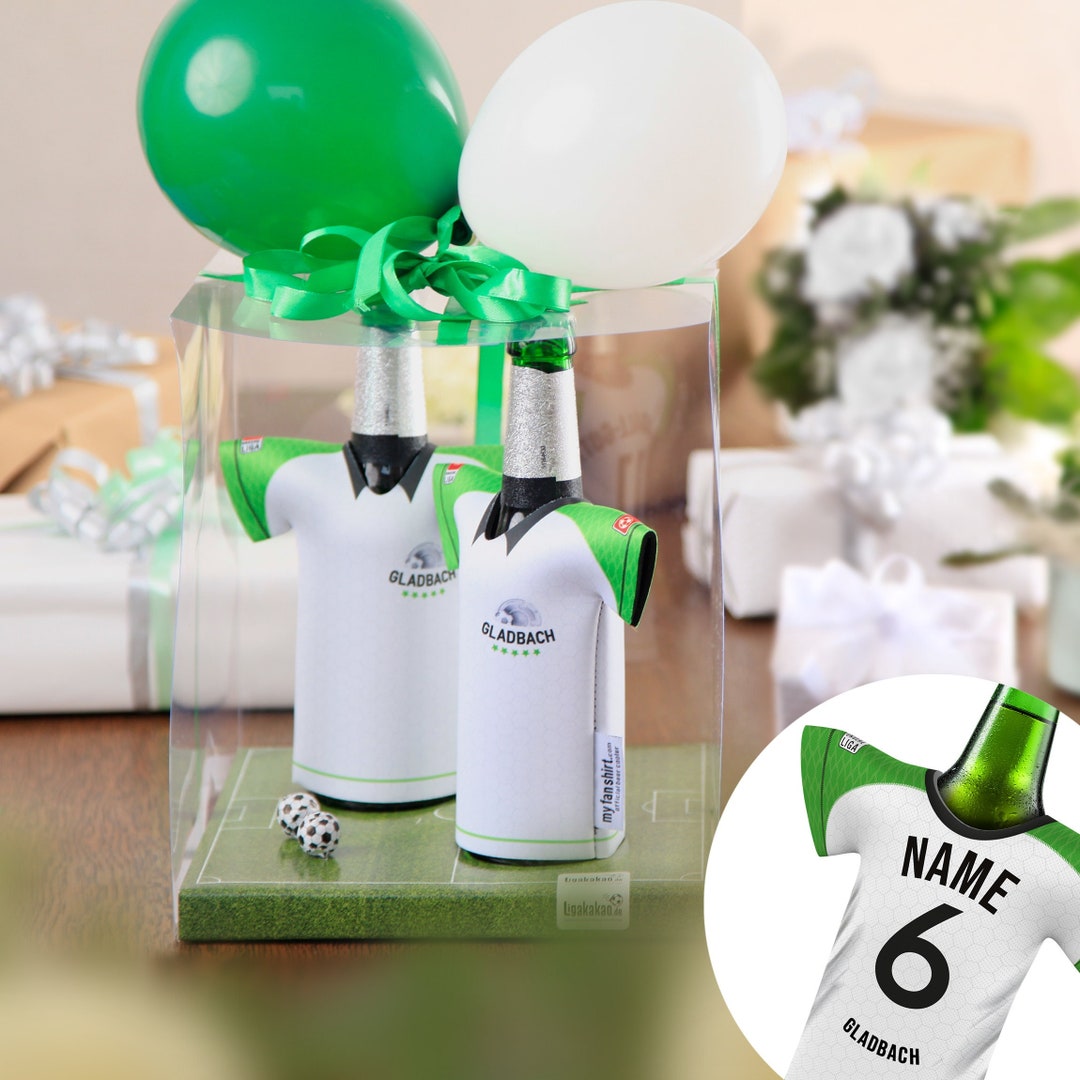 Für alle echten Gladbach-Fans: Dieser coole Trikotkühler von my fan shirt macht jeden Schluck zum Erlebnis! Das Besondere: Du kannst ihn personalisieren und so zu einem einzigartigen Einzelstück machen. Hergestellt in Deutschland in hochwertiger Handarbeit, garantiert er lebenslange Freude. In der 'Fußball-Gott Edition' ist das Trikot schon mit dem entsprechenden Aufdruck versehen. Das Set kommt in einer tollen Fußballplatz-Geschenkbox - komplett mit XL-Grußkarte, Geschenkband, Ballons in Vereinsfarben und Mini-Fußbällen. Alles fertig zum Verschenken! Und als Aktions-Deal gibt's oft noch drei Premium-Trikotkühler inklusive Premium-Türschild gratis dazu. Einfach 'myfanshirt + verein' suchen und über 200 Vereine entdecken. Perfekt für Partys, Spieleabende oder als Geschenk für den besten Kumpel!