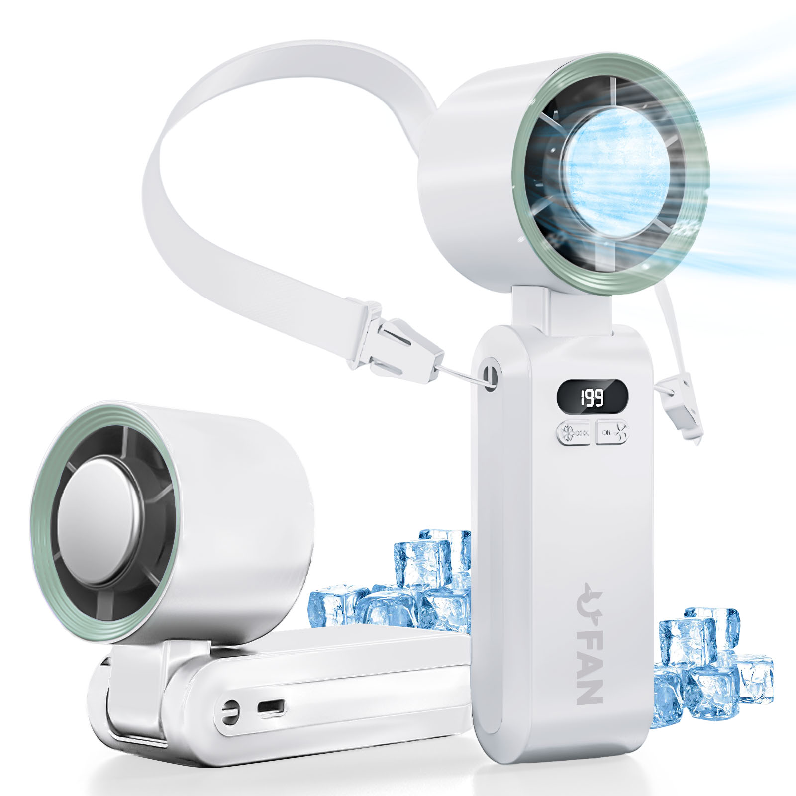 Puh, ist das heiß! 🔥 Dieser geniale 3-in-1 Ventilator bringt dir Abkühlung, wo immer du bist! Mit der einzigartigen Eiskühl-Funktion spürst du sofort die erfrischende Kälte - wie eine Mini-Klimaanlage für unterwegs!\n\nDie verstellbare Geschwindigkeit von 1-100 gibt dir totale Kontrolle über deine persönliche Brise. Ganz sanft oder richtig turbo-stark - alles ist möglich! Und das LED-Display zeigt dir immer an, was gerade los ist.\n\nDas 3-in-1 Design ist der absolute Knaller: Als Handventilator, um den Hals gehängt oder als Tischventilator - immer perfekt für deine Bedürfnisse. Der drehbare Kopf lässt sich um 90° neigen, damit du die kühle Luft genau dorthin lenken kannst, wo du sie brauchst.\n\nMit dem 2400mAh Akku hält er lange durch und lädt einfach per USB-C auf. Das umhängbare Band gibt dir die Hände frei - super praktisch beim Einkaufen, Wandern oder im Büro.\n\nNur 230g leicht und kompakt genug für jede Handtasche oder Rucksack. Ob im stickigen Büro, in der vollen Bahn oder beim Sport - dieser Ventilator ist dein Retter in der Hitze! Hol dir jetzt die coole Erfrischung! 💨