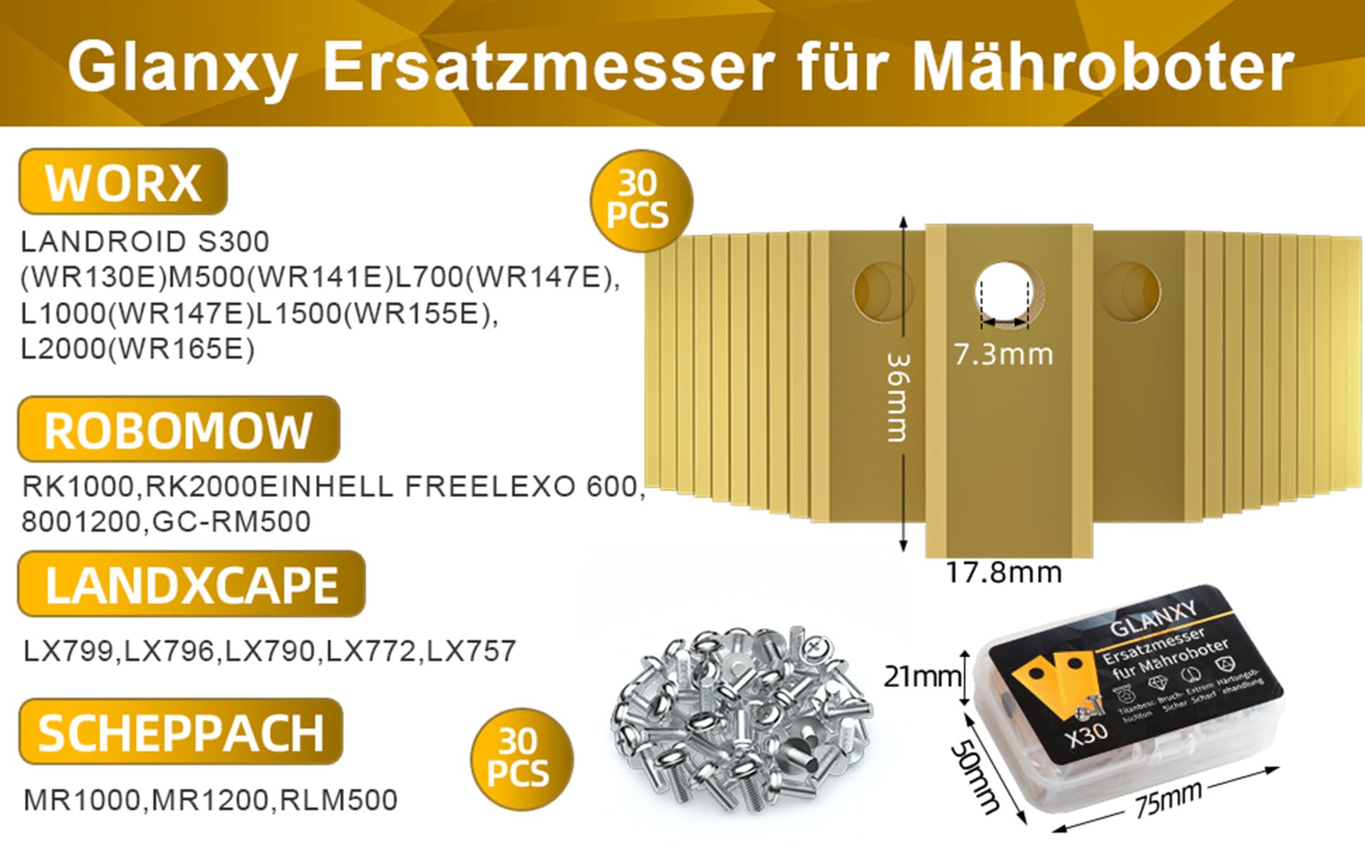 Dein Mähroboter braucht neue Klingen? Dieses Set mit 30 Titan-Messern ist die perfekte Lösung! Kompatibel mit Worx, LandXcape, Zoef Robot und Einhell Rasenrobotern. Die Klingen haben eine Stärke von 0,75mm und wiegen nur 3g - super leicht aber extrem stabil. Mit Titannitrid-Beschichtung für maximale Härte und Korrosionsbeständigkeit. Beidseitig geschliffen für saubere Schnitte ohne ausgefranste Grashalme. Das bogenförmige Design optimiert den Schnittwinkel für einen perfekt ebenen Rasen. Im Lieferumfang sind 30 Messer + 30 Schrauben - alles was du für den Wechsel brauchst. Die optimierte Gewindetiefe sorgt für perfekten Sitz, die Schrauben lösen sich nicht durch Vibrationen. Einfach wechseln und dein Mähroboter läuft wieder wie neu. Spart Zeit und Geld gegenüber Originalteilen!