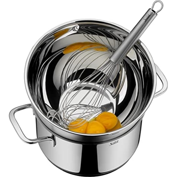 Kochbegeisterte aufgepasst! Dieses 4-teilige Edelstahl-Schüssel-Set von Homikit macht das Kochen und Backen zum puren Vergnügen. Enthalten sind 4 Schüsseln in verschiedenen Größen: 4,5L, 2,7L, 2,5L und 1,2L - für jede Aufgabe die richtige Größe! Jede Schüssel hat einen luftdichten Deckel, perfekt zum Frischhalten von Lebensmitteln. Das Set kommt mit 10 praktischen Küchenhelfern: Messbecher 5er Set, Gemüsehobel, Schneebesen, Spatel, Jar Spatel und Eiertrenner. Aus gesundem, lebensmittelechtem Edelstahl - spülmaschinenfest (nur die Deckel bitte von Hand waschen). Die Schüsseln sind stapelbar und platzsparend. Mit hochglanzpoliertem Innenbereich für einfache Reinigung. Ein komplettes Küchen-Set das nichts zu wünschen übrig lässt!