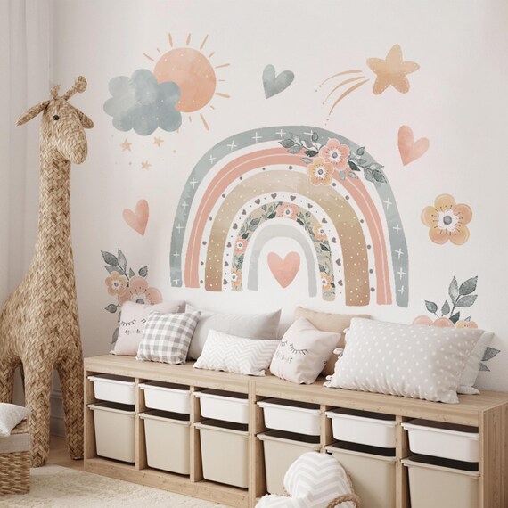 Verwandle das Kinderzimmer in eine magische Traumwelt! Dieses riesige Set mit 82 Wandtattoos bringt Farbe und Fröhlichkeit an jede Wand. Enthalten sind süße Regenbögen, Sterne, Sonnen und Liebesmotive im angesagten Boho-Stil. Die Aufkleber sind supereinfach anzubringen: Oberfläche säubern, Aufkleber abziehen und festdrücken - keine Blasen, kein Ärger! Das hochwertige Material haftet super auf glatten Wänden, Glas, Holz oder Fliesen und lässt sich bei Bedarf auch wieder rückstandslos entfernen. Besonders praktisch: Die Aufkleber sind verschleißfest und verblassen nicht, sodass die Freude lange erhalten bleibt. Und das Wichtigste: absolut ungiftig und geruchlos - perfekt für das Kinderzimmer! Egal ob du eine komplette Wand gestalten möchtest oder nur ein paar Akzente setzen willst - mit diesem Set hast du unendlich viele Möglichkeiten. Ein wunderbares Geschenk zur Geburt oder zum Einzug in das neue Kinderzimmer!