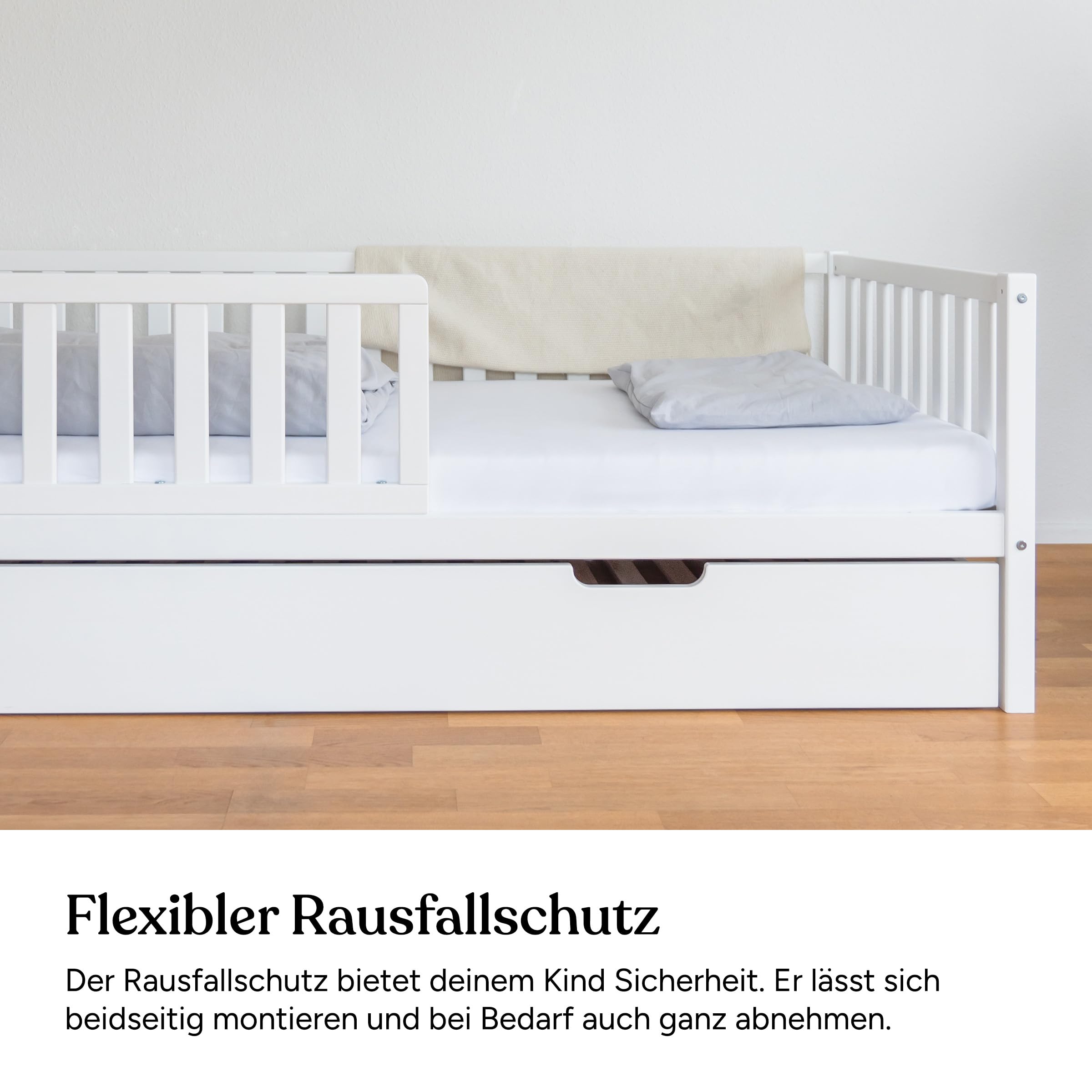 Das perfekte erste Bett für dein Kind! Dieses Ehrenkind Kinderbett aus FSC-zertifizierter Buche ist ein echter Klassiker. Mit 90x200cm Größe hat dein Kind lange Freude daran. Der beidseitig montierbare Rausfallschutz sorgt für Sicherheit, die niedrige Einstiegshöhe ermöglicht selbstständiges Ein- und Aussteigen. Inklusive stabilem Lattenrost aus Buche. Mit praktischer Doppelschublade für Spielzeug oder Bettwäsche. In Natur oder weiß mit kindersicherem Lack erhältlich. Zeitloses Design das in jedes Kinderzimmer passt. Fair in Europa produziert mit kurzen Lieferwegen. Ein Bett das mitwächst - von den ersten eigenen Nächten bis ins Schulalter. Für alle die Wert auf Nachhaltigkeit und Sicherheit legen!