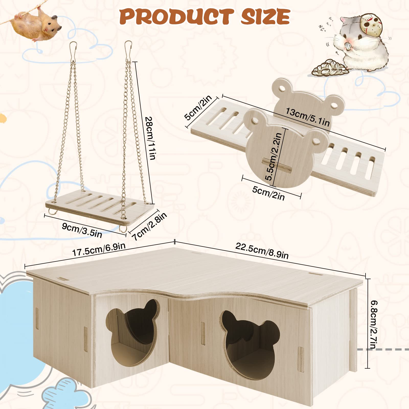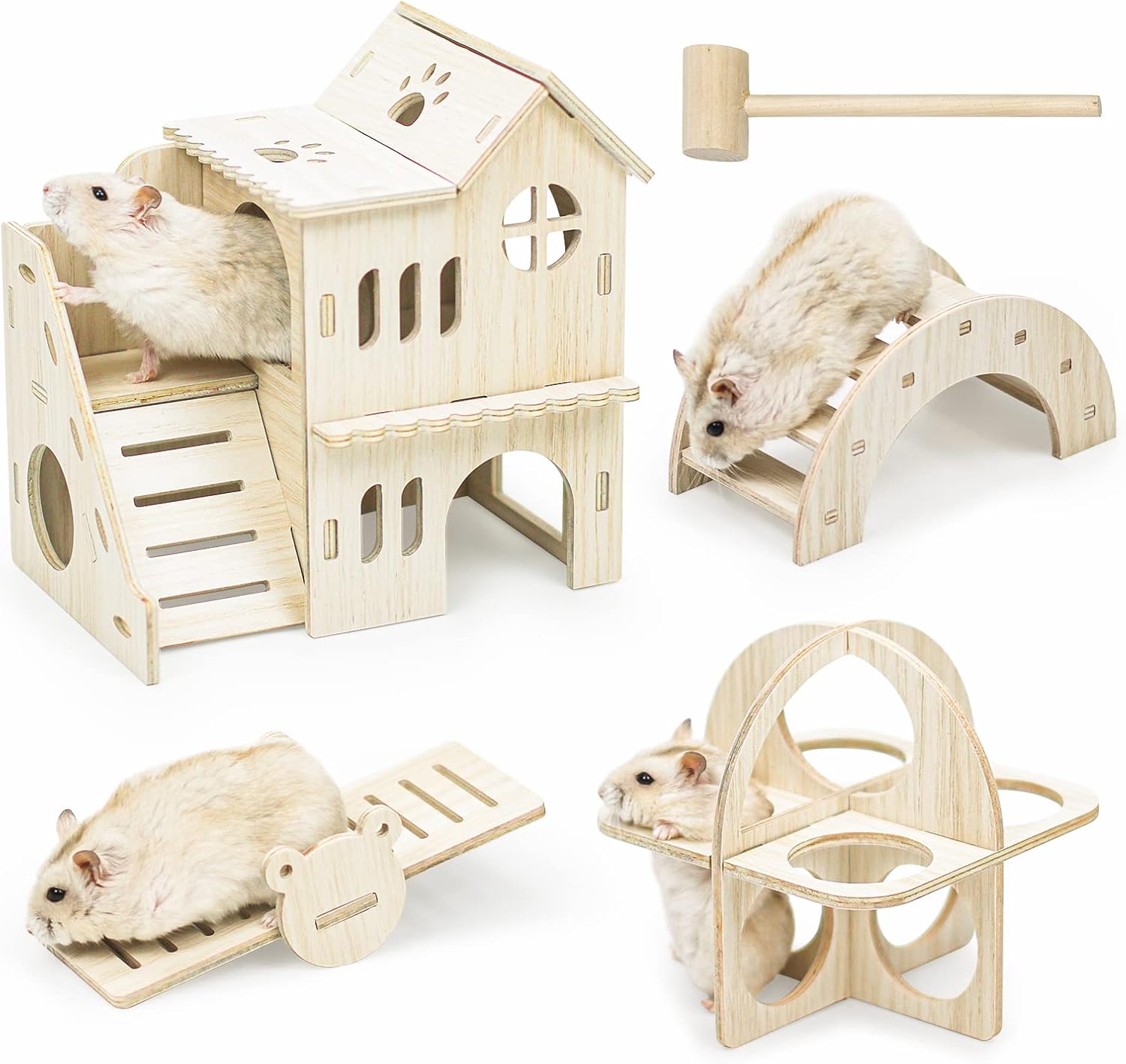 Dein Hamster wird verrückt spielen vor Freude! Dieses 5-in-1 Spielzeugset aus Holz verwandelt den Käfig in einen Abenteuerspielplatz. Enthalten sind: ein DIY-Haus zum Verstecken, eine Wippe zum Balancieren, eine Brücke zum Überqueren, eine Schaukel zum Schaukeln und ein Trainingsball zum Spielen. Alles aus purem Naturholz ohne künstliche Farbstoffe - komplett sicher für deine kleinen Lieblinge! Die Kanten sind alle abgerundet und es gibt keine scharfen Ecken, an denen sich dein Tierchen verletzen könnte. Einfach zusammenstecken - schon hat dein Hamster sein eigenes kleines Reich! Das Holz ist getrocknet und wasserabweisend behandelt, sodass es lange hält. Perfekt nicht nur für Hamster, sondern auch für Rennmäuse, Streifenhörnchen, Chinchillas und andere kleine Nager. Dein Haustier wird beschäftigt sein, kaut nicht mehr am Käfig und bleibt aktiv und gesund. Und das Beste: Du kannst beim Zusammenbauen sogar mithelfen! Achte darauf, die Teile nicht mit Gewalt zusammenzudrücken und stell das Spielzeug nicht an feuchte Orte. Mach deinem kleinen Freund eine Freude - mit diesem mega Spielset!