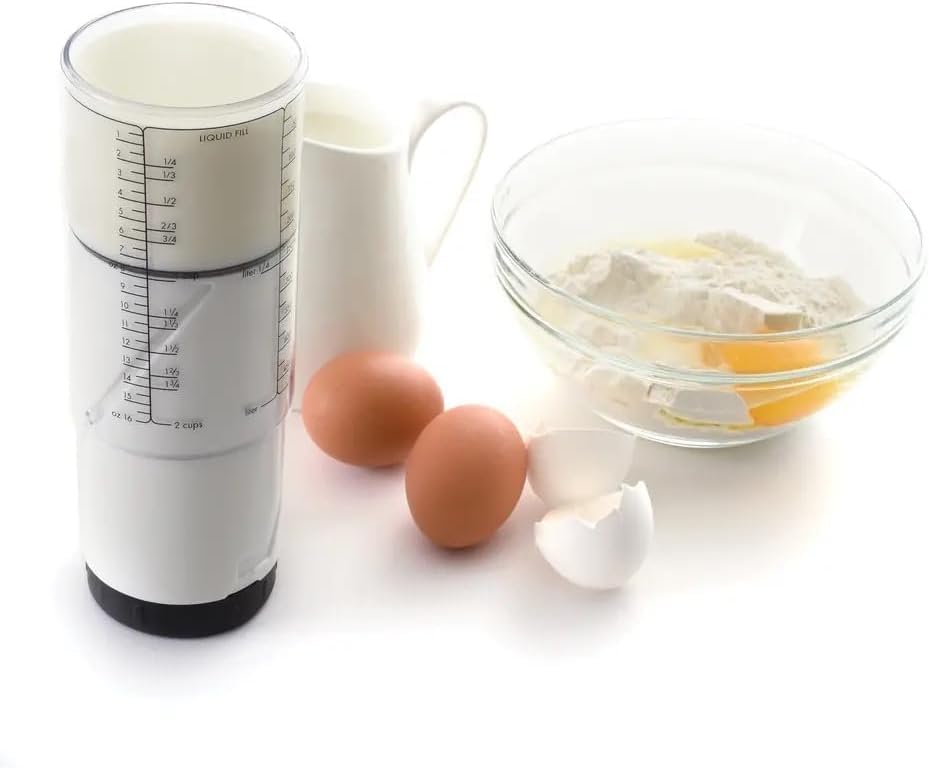 Dieser 4-in-1 Messbecher ist der absolute Küchen-Helfer! Er ersetzt vier einzelne Becher - misst ¼, ⅓, ½ und 1 Cup in einem Tool. Perfekt fürs Backen, Kochen oder Portionieren. Mit verstellbarem Schaber-Boden - kein Klebenbleiben von honig, Erdnussbutter oder Sirup mehr! Doppelte Skalierung in ml und fl oz, gut ablesbar und langlebig. Einfach zu reinigen, spülmaschinengeeignet und platzsparend. Ideal für die heimische Küche, im Wohnmobil oder beim Camping. Spart Zeit, Platz und Nerven - was will man mehr? Inklusive Schwammbürste für noch mehr Komfort. Hol dir diesen cleveren Messbecher und mach deine Küchenarbeit einfacher!