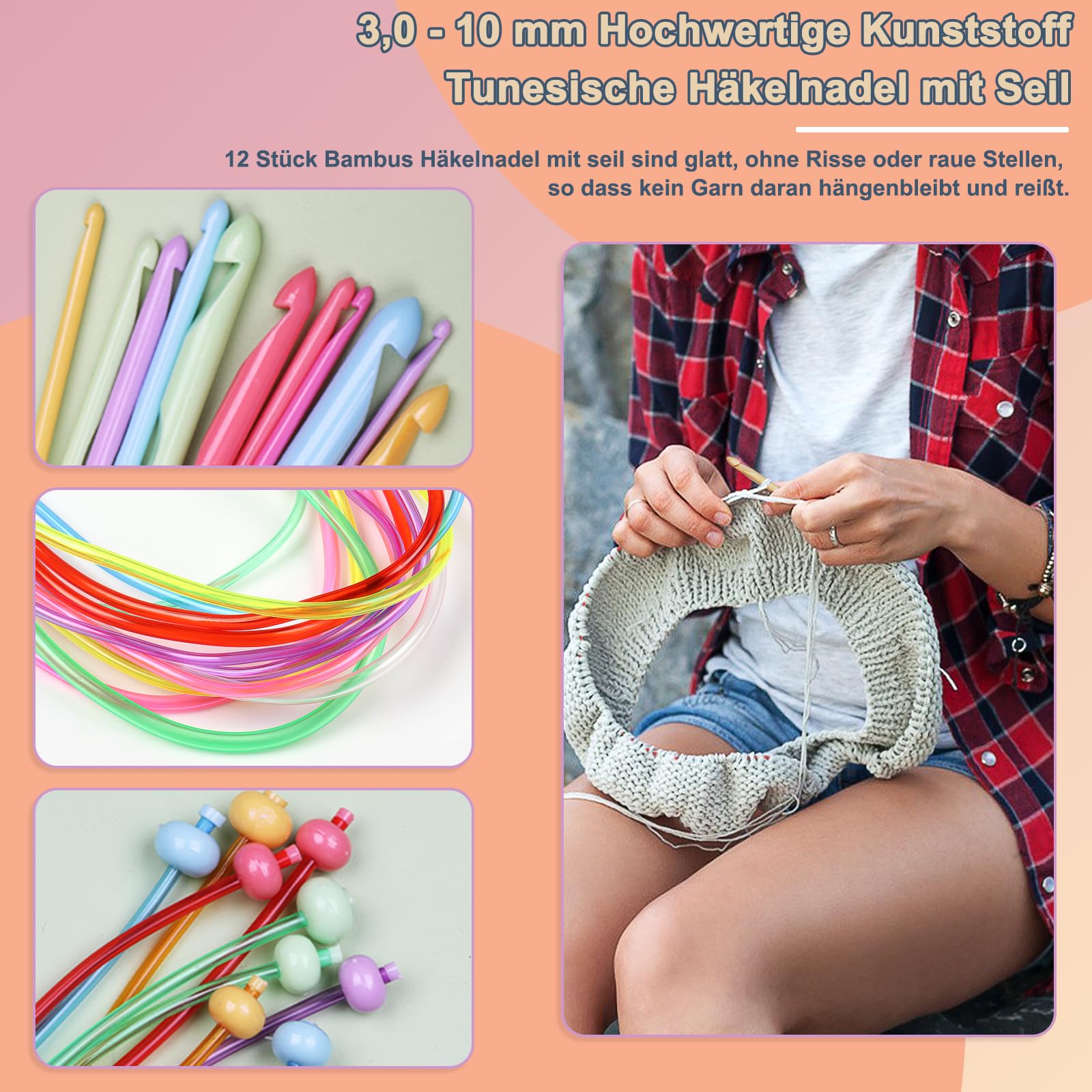 Perfekt für alle Häkelfans! Dieses umfangreiche Set mit tunesischen Häkelnadeln hat alles, was du brauchst. Von 3,0mm bis 10mm sind alle gängigen Größen dabei - ideal für Decken, Pullover, Teppiche und mehr. Die Aluminium-Nadeln gleiten super smooth durchs Garn und verhaken sich nicht. Mit 4 verschiedenen Kabellängen (40, 60, 80, 100 cm) bist du für jedes Projekt gerüstet. Alles sicher verstaut in einer stylischen Aufbewahrungsbox - super praktisch für unterwegs. Ob Anfänger oder Profi - mit diesem Set machst du nichts verkehrt. Ein tolles Geschenk für kreative Menschen!
