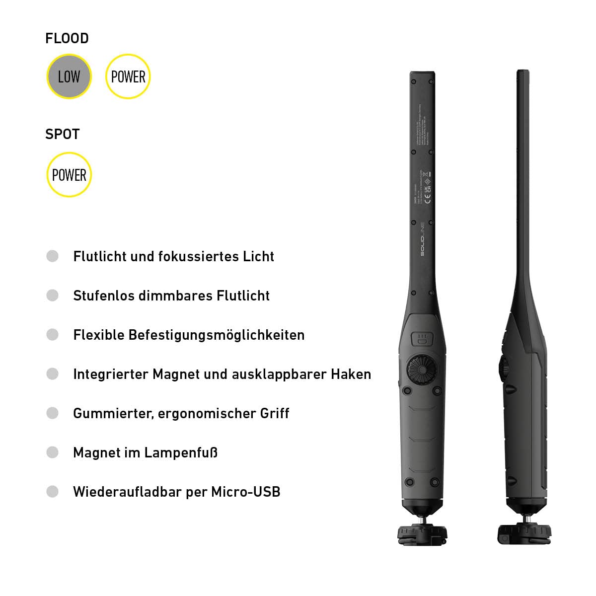 Endlich die perfekte Beleuchtung für jede Werkstatt oder Garage! Die SOLIDLINE SW5R LED-Lampe bringt es auf satte 800 Lumen und leuchtet bis zu 40 Meter weit. Mit zwei separaten Lichtquellen: Flutlicht für große Bereiche und fokussiertes Licht für präzise Arbeiten. Und das alles stufenlos dimmbar! Der integrierte Magnet, das Kugelgelenk und der ausklappbare Haken geben dir totale Flexibilität bei der Positionierung. Der gummiert Griff liegt super in der Hand, auch mit Arbeitshandschuhen. Aufladen per Micro-USB - praktisch und immer einsatzbereit. Mit Akku- und Ladestandsanzeige weißt du immer, wie viel Power noch drin ist. Ob Auto reparieren, Heimwerken oder Camping - diese Lampe ist dein zuverlässiger Begleiter!
