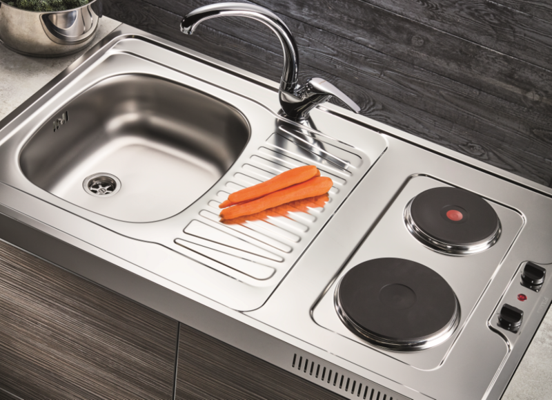 Platzsparende Genialität für kleine Küchen! Diese 100 cm breite Edelstahl-Spüle kombiniert Spülbecken und Kochfeld in einem. Mit zwei Kochplatten die sich in 7 Stufen regulieren lassen - vom sanften Simmern bis zum kräftigen Kochen.