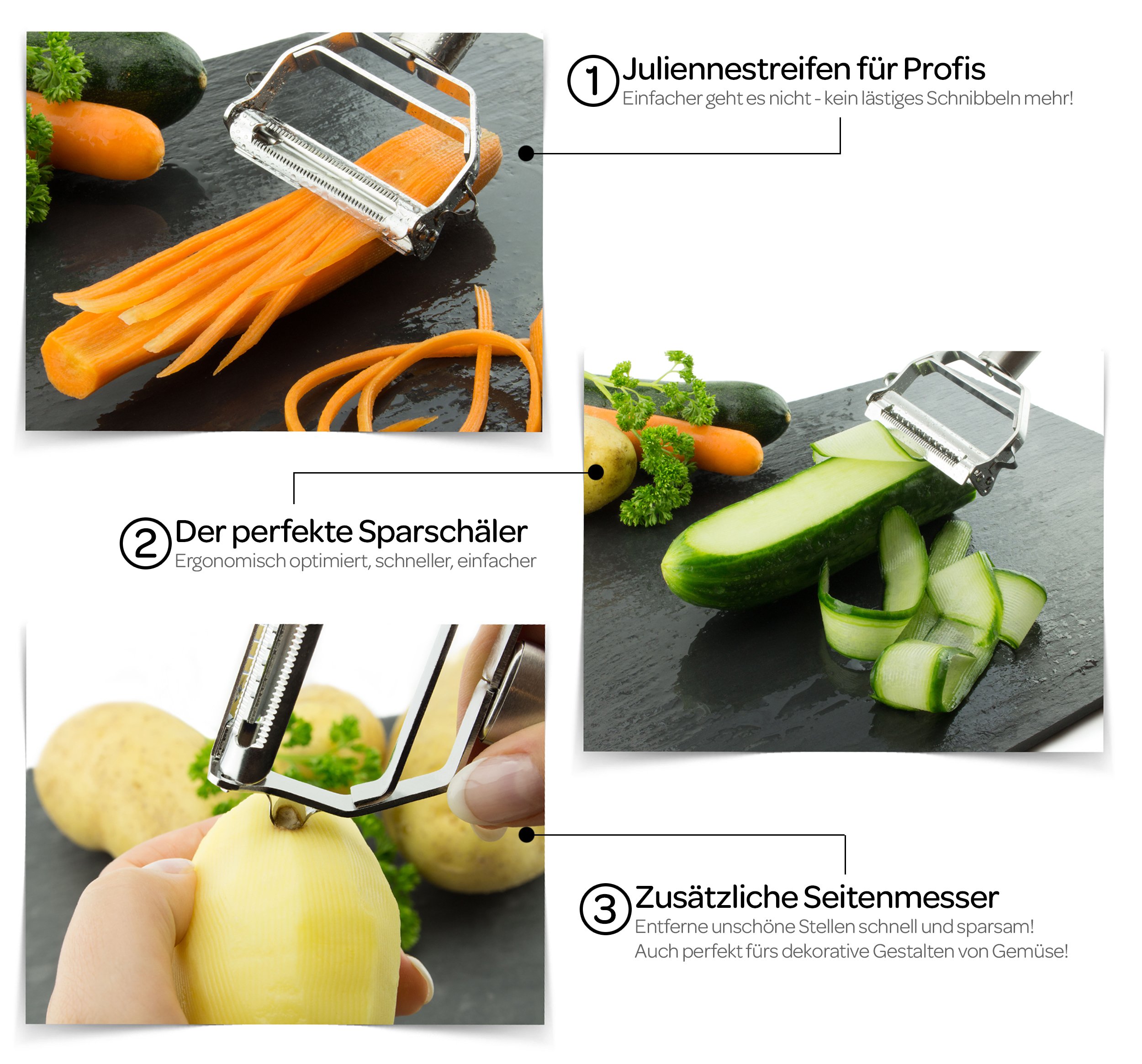 Kochst du gern, aber das Schälen und Schneiden nervt? Dieser 4-in-1-Schäler macht’s zum Kinderspiel! Mit ihm schälst du nicht nur Kartoffeln und Möhren, sondern schneidest auch superfeine Julienne-Streifen – perfekt für Salate, Garnieren oder gesunde Zucchini-Spaghetti. Die Klingen sind aus robustem Edelstahl, scharf und spülmaschinenfest. Das Design ist ergonomisch, liegt super in der Hand (egal ob Rechts- oder Linkshänder) und hat sogar ein Loch zum Aufhängen. Kein Rutschen, kein Ärger. Aus sicherem, lebensmittelechtem Material. Ein echter Küchen-Allrounder, der Zeit spart und richtig Spaß macht. Einfach mal ausprobieren – dein Gemüse wird’s dir danken!