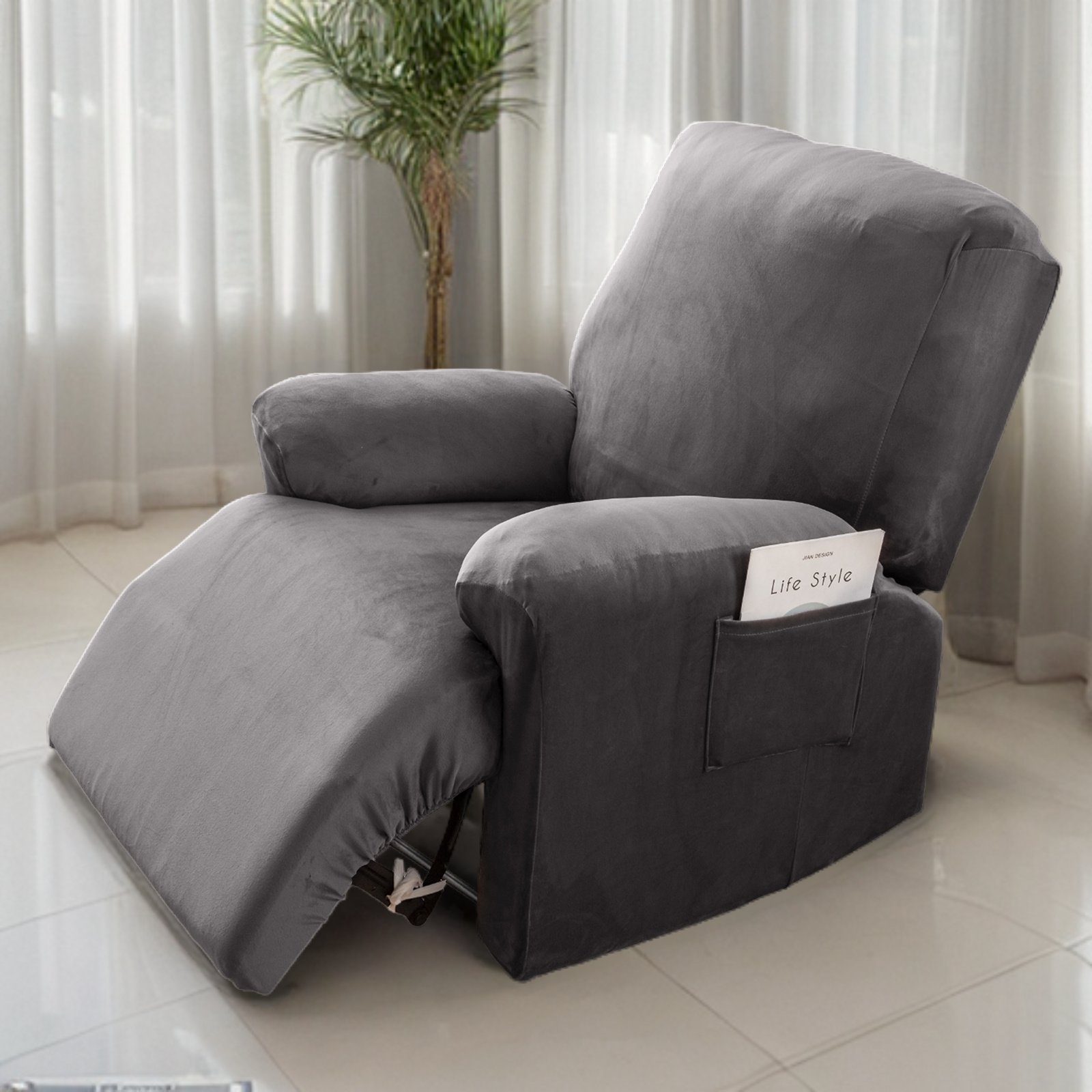 Dein Relaxsessel sieht schon etwas mitgenommen aus? Diese Stretch-Hülle macht ihn wie neu! Aus 85% Polyester, 15% Elasthan - dehnbar und bequem. Mit praktischen Seitentaschen für Fernbedienung, Zeitschriften oder Handy. Einfach überziehen - fertig ist die Frischzellenkur! Schützt vor Haaren, Flecken und Abnutzung - besonders mit Kindern oder Haustieren super! Waschbar in der Maschine - immer frisch und sauber. In Grigio Scuro (Dunkelgrau) - passt zu jedem Einrichtungsstil. Maße: Vorne 76-96cm, Hinten 60-82cm, Höhe 73-93cm. Mit deinem Sessel verwandelt er sich im Handumdrehen! Keine komplizierte Montage - einfach drüber und fertig. Verlängert die Lebensdauer deines Sessels enorm. Auch perfekt für gebrauchte Möbel - sieht aus wie neu! Hol dir diesen praktischen Bezug und freu dich jeden Tag über deinen frischen Sessel!