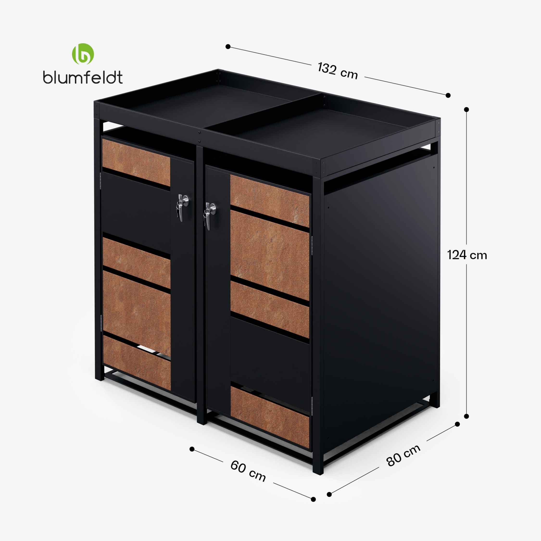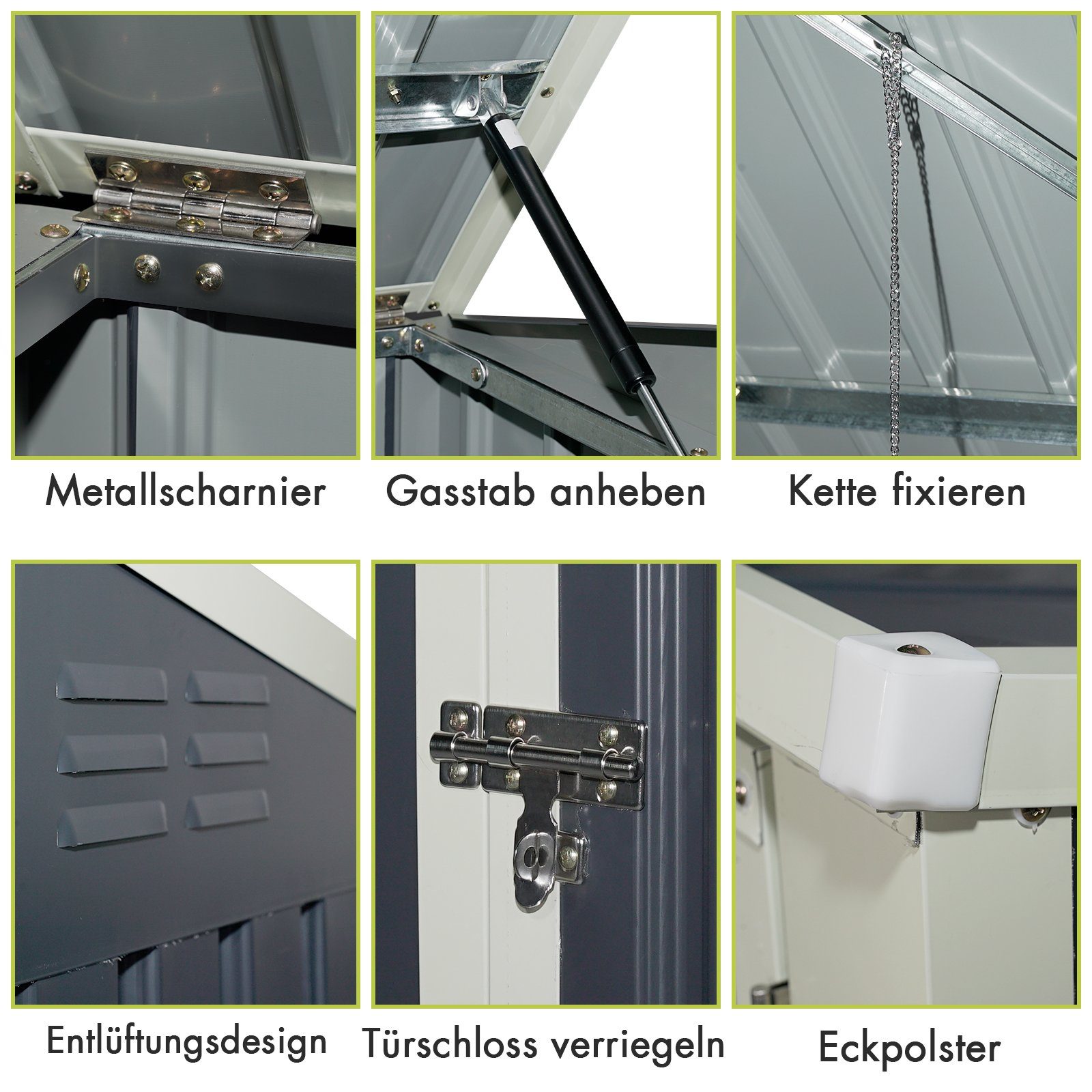 Schluss mit unschönen Mülltonnen im Garten! Diese praktische Mülltonnenbox aus verzinktem Metall bietet Platz für zwei Tonnen und schützt sie vor Regen, Sonne und neugierigen Blicken. Besonders clever: Der obere Klappdeckel öffnet sich mit Gasdruck-Federn ganz leicht, und zwei seitliche Türen geben zusätzlichen Zugang. Sogar die Mülltonnendeckel kannst du mit den beiliegenden Ketten automatisch mitöffnen! Die dreieckige Verstärkung und Eckenschützer machen die Box extrem stabil. Mit den Maßen 172x95,5x130 cm passt sie in die meisten Vorgärten. Einfach mit feuchtem Tuch reinigen - mehr Pflege braucht das robuste Metall nicht. Wird inklusive 2 Paar Handschuhe geliefert!