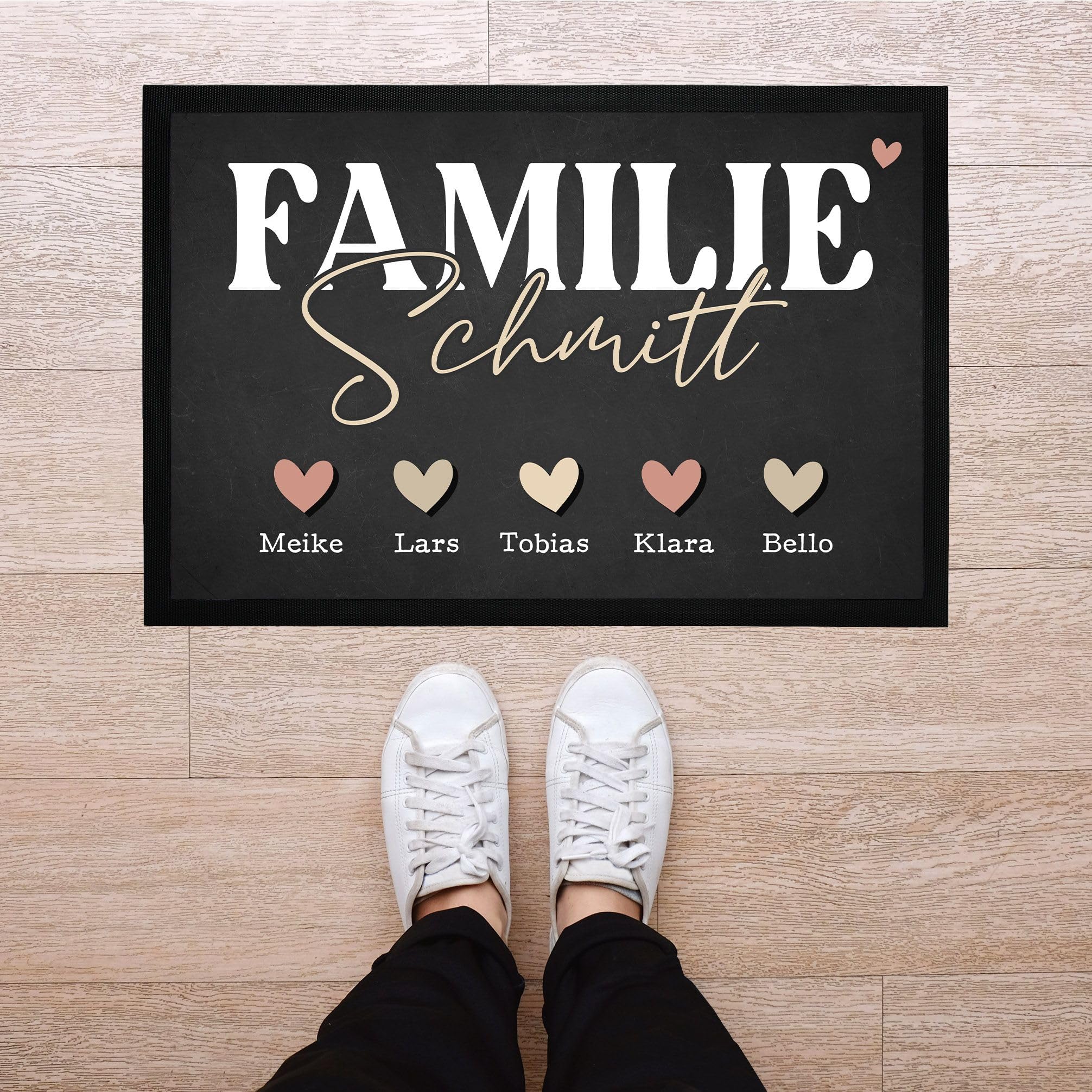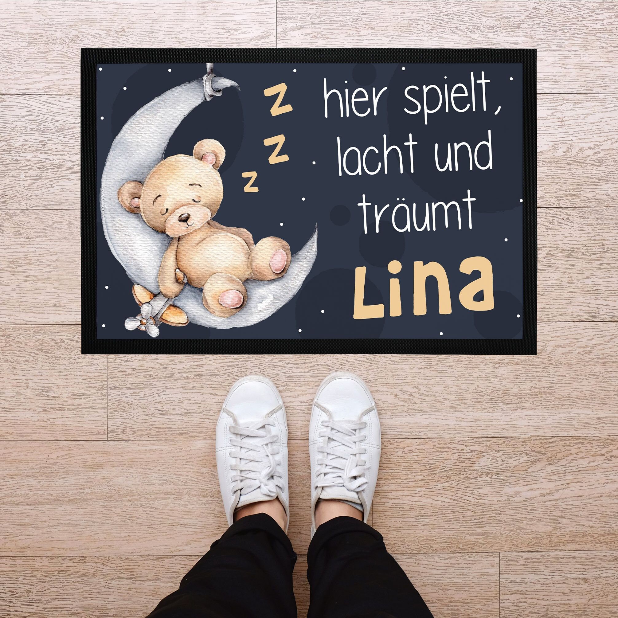 Eine ganz persönliche Überraschung fürs Kinderzimmer! Diese Fußmatte wird mit dem Namen deines Kindes personalisiert und zeigt niedliche Elefanten, Hasen, Mond und Sterne. Mit dem Spruch 'Hier spielt, lacht und träumt' + Wunschname. Maße 60x40cm - perfekt vor der Zimmertür oder als kleiner Teppich. Rutschfeste Gummi-Unterseite und waschbar - einfach mit milder Seife reinigen und an der Luft trocknen lassen. Oberseite aus Polyester, Unterseite aus PVC. In Deutschland in Handarbeit bedruckt für beste Qualität. Super als Geschenk zur Geburt, Taufe, Geburtstag oder Weihnachten. Mach deinem Kind eine Freude mit diesem individuellen Türvorleger!