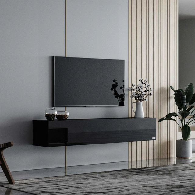Modernes Wohnen war noch nie so einfach! Dieses hängende Lowboard von HAJDUK bringt Stil und Ordnung in dein Wohnzimmer. Mit 90cm Breite ist es perfekt für Fernseher bis 40 Zoll. Das Push-to-Open-System ist der Hit - einfach leicht drücken und die Klappe öffnet sich elegant, ganz ohne sichtbare Griffe! Aus hochwertigem MDF in schwarzem Hochglanz sieht es einfach edel aus. Durch die Wandmontage sparst du Bodenfläche und gewinnst Raum. Die offene Rückwand macht das Kabelmanagement supereinfach - Steckdosenleisten bis 16cm Tiefe passen problemlos. Verfügbar auch in 180cm und 270cm - du kannst mehrere Module kombinieren und so deine perfekte Wohnwand gestalten. Ob als TV-Schrank, Sideboard oder Medienregal - dieses Lowboard ist vielseitig einsetzbar und macht in jedem Wohnzimmer eine gute Figur. Einfach montieren und sich über mehr Stauraum und weniger Kabelsalat freuen!
