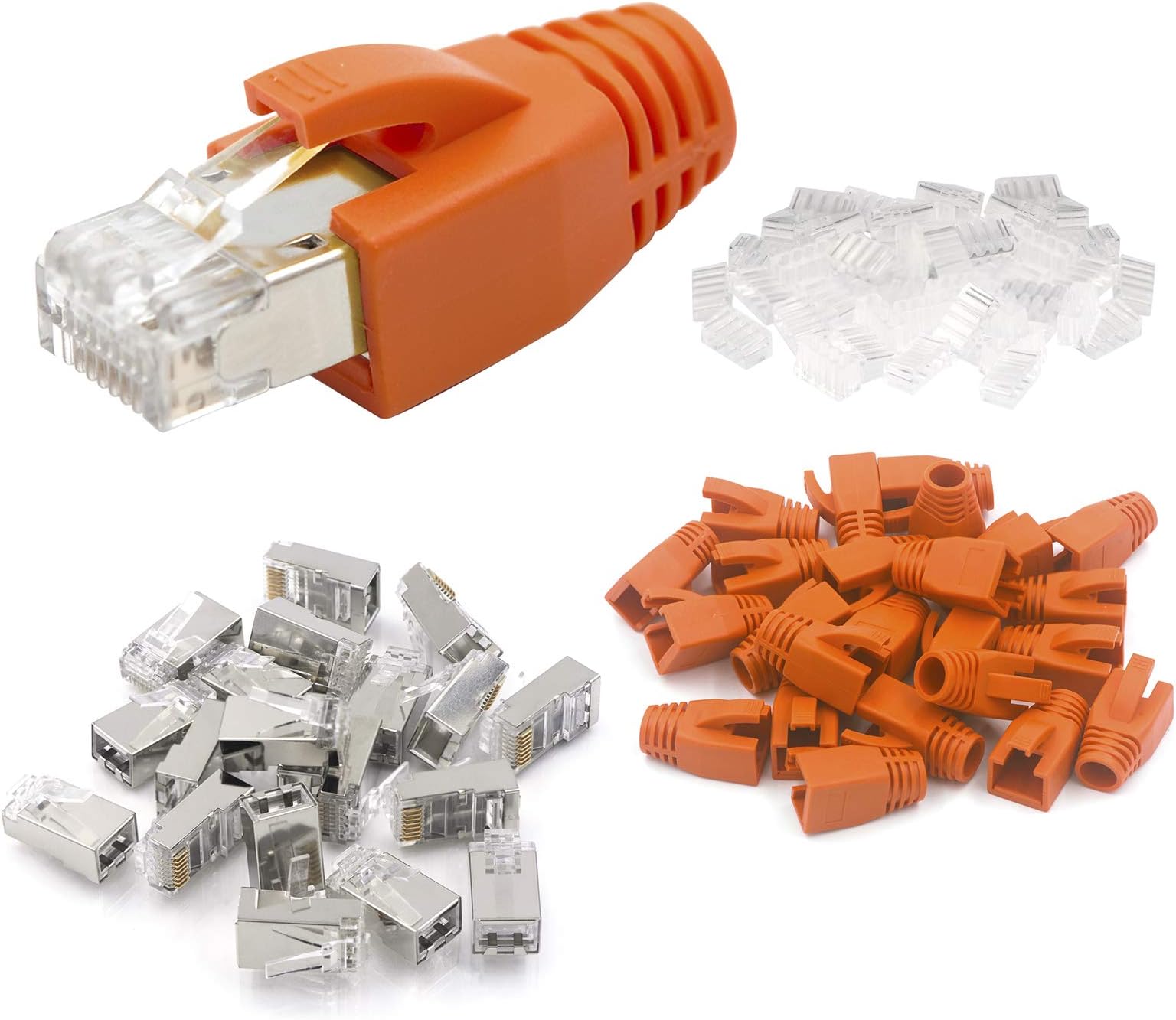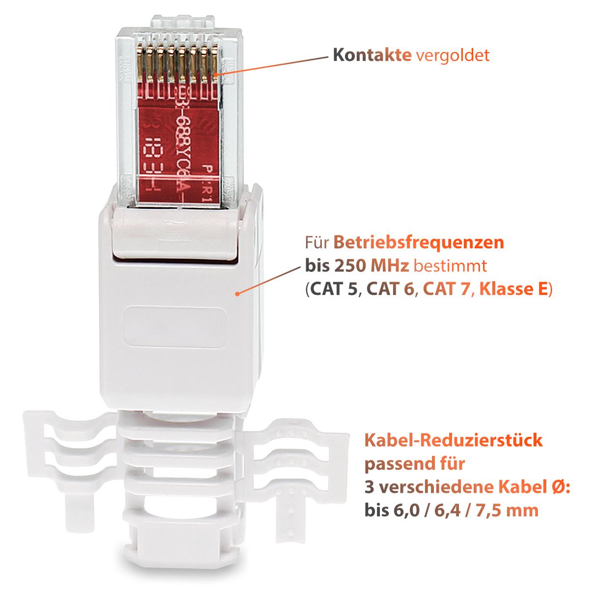 Netzwerkkabel selbst machen - ganz ohne Spezialwerkzeug! Diese NAUC RJ45 Stecker sind echt praktisch. CAT6 kompatibel, also perfekt für schnelle Gigabit-Verbindungen. Die Kontakte sind vergoldet und das Gehäuse geschirmt - beste Qualität für stabile Verbindungen. Einfach die farbigen Adern entsprechend der Markierung einstecken, dann den Stecker zusammendrücken - fertig ist dein LAN-Kabel! Passt für Kabel-Durchmesser bis 7,5mm und ist abwärtskompatibel zu CAT5e, CAT6A und CAT7. Super für Heimnetzwerke, Büros oder Rechenzentren. Mit 6 Stück im Set hast du genug für mehrere Kabel. Nie wieder wackelige Stecker oder komplizierte Crimp-Zangen - so einfach war Netzwerkarbeiten noch nie!