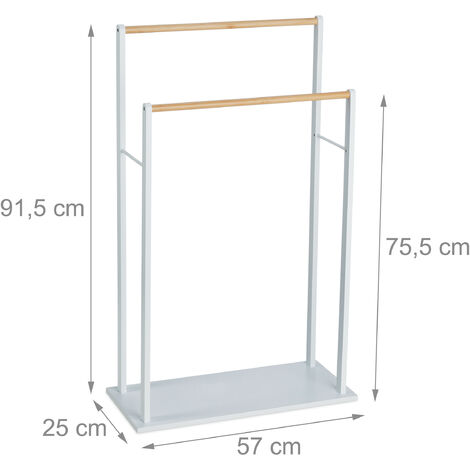 Brauchst du mehr Platz für Handtücher im Bad? Dieser freistehende Handtuchständer von Relaxdays ist perfekt! Aus Bambus und MDF in weiß/natur gefertigt, sieht er nicht nur gut aus, sondern ist auch super praktisch. Mit 2 versetzten Stangen in 90,5cm und 75,5cm Höhe trocknen Handtücher schnell durch gute Luftzirkulation. Maße: 91,5 x 57 x 25 cm - kompakt und platzsparend. Die Gummifüße schützen deinen Boden vor Kratzern. Einfach zusammenzubauen, ohne Bohren - ideal für Mieter! Jede Stange trägt bis zu 2kg. Perfekt für Handtücher, Duschtücher oder auch Kleidung. Ein stylisches Möbelstück, das Ordnung ins Bad bringt. Also, wenn du eine praktische Handtuchlösung suchst, bist du hier goldrichtig!