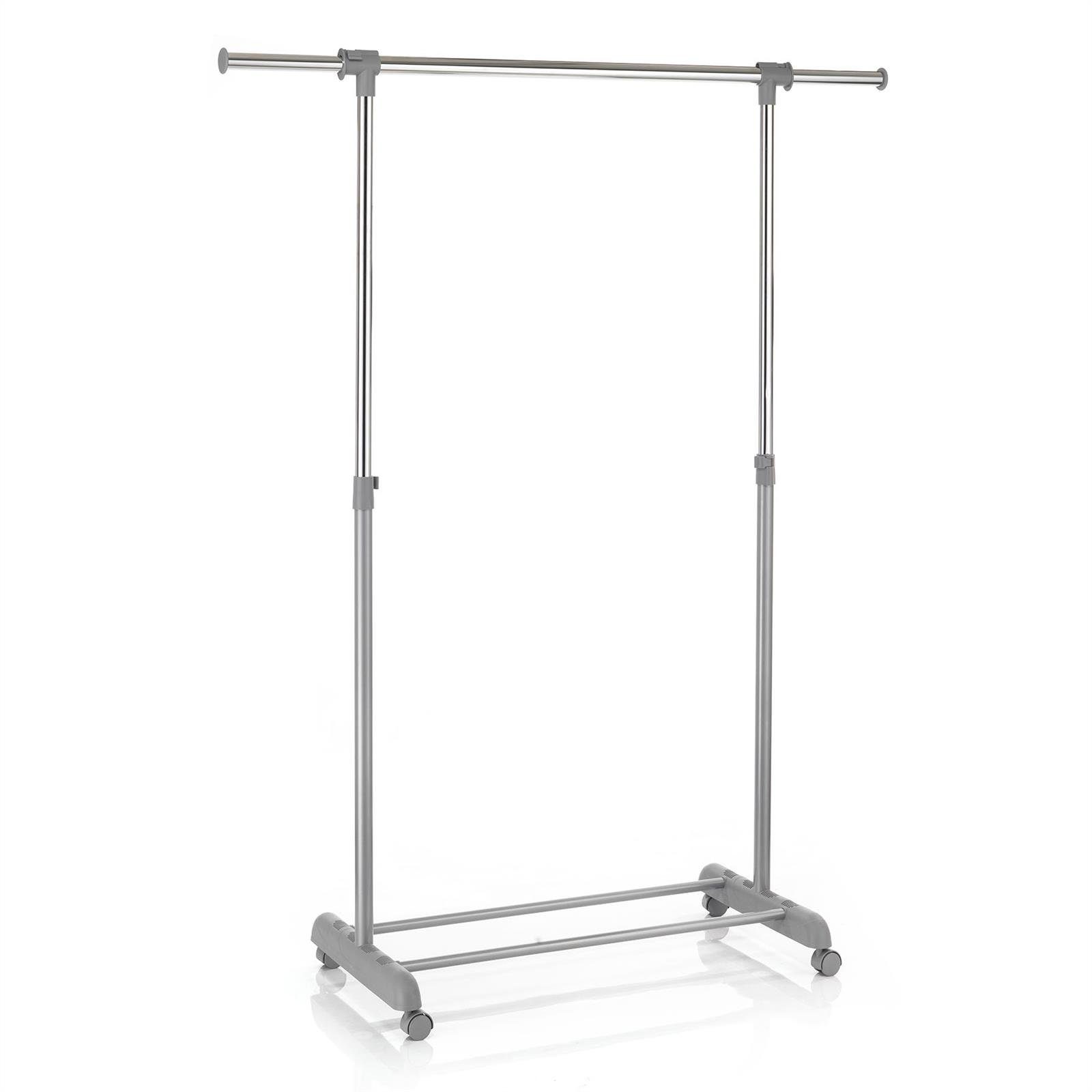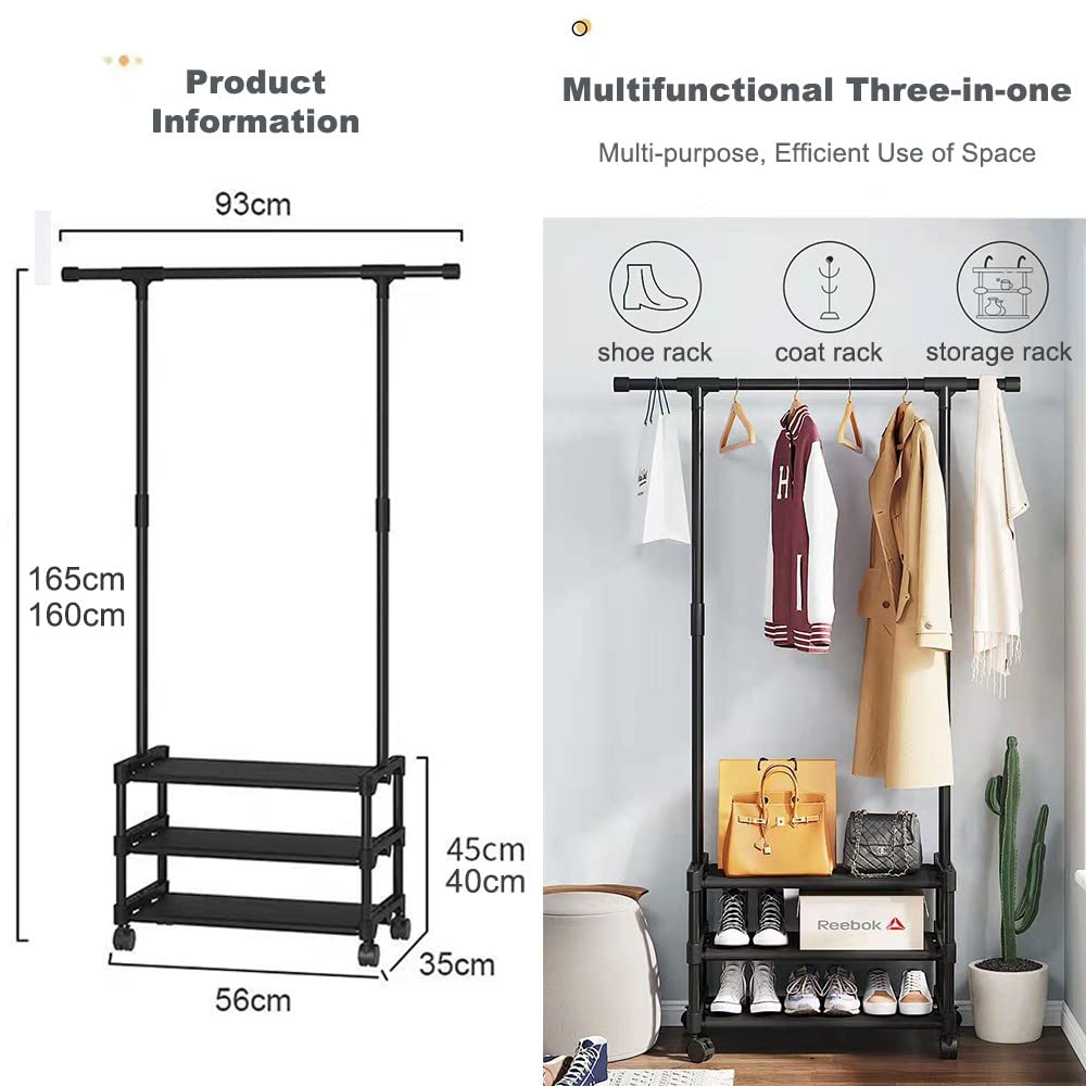 Endlich Ordnung im Kleiderschrank! Diese coole Rollgarderobe ist dein neuer bester Freund gegen das Kleiderchaos. Mit 4 praktischen Rollen schiebst du sie einfach dorthin, wo du sie gerade brauchst - ob im Schlafzimmer, Flur oder sogar in der Garage.\n\nWas die Garderobe so besonders macht:\n• 4 lenkbare Rollen - super beweglich!\n• Doppelstangen für doppelten Stauraum\n• Integrierte Bodenablage für Schuhe oder Taschen\n• Aus robustem Stahl - hält ewig\n• Maße: ca. 57x7x13 cm\n\nEgal ob Jacken, Hosen, T-Shirts oder Accessoires - hier findet alles Platz. Die Stangen sind so stabil, dass du auch mehrere Kleidungsschichten aufhängen kannst, ohne dass etwas durchhängt.\n\nPerfekt für:\n• Kleine Wohnungen\n• Studentenbuden\n• Gästezimmer\n• Als zusätzlicher Stauraum\n• Die Waschküche\n\nSuper praktisch: Die Rollen haben eine Sperre, damit die Garderobe nicht ungewollt wegrollt. So steht sie sicher und fest, wo du sie haben willst.\n\nWarum du diese Garderobe lieben wirst:\n• Macht sofort Ordnung\n• Sieht modern aus\n• Einfach zusammenzubauen\n• Preis-Leistung ist top\n• Passt in jeden Raum\n\nExtra-Tipp: Stell sie neben den Kleiderschrank und du hast deine Lieblingskleidung immer griffbereit. So startest du morgens ohne langes Suchen!\n\nWichtig: Die Garderobe ist aus verstärktem Stahl und PP gefertigt - das hält wirklich was aus. Selbst vollbelastet bleibt sie stabil und kippt nicht um.