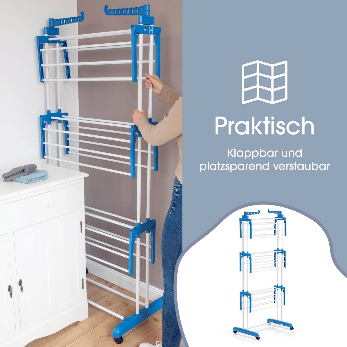 Endlich ein Wäscheständer, der wirklich alle deine Wäscheprobleme löst! Der EASYmaxx Wäsche-Tower bietet dir satte 16 Meter Trockenlänge auf drei Ebenen - das reicht locker für zwei komplette Waschmaschinenladungen. Mit bis zu 20kg Traglast kannst du sogar schwere Handtücher und Jeans problemlos aufhängen. Die beiden Seitenflügel bieten Platz für bis zu 14 Kleiderbügel, perfekt für Hemden und Blusen. Besonders praktisch: Du kannst die Ebenen auch nur einseitig ausklappen und so richtig Platz sparen. Die vier Räder machen ihn super mobil - einfach in die Dusche schieben oder auf den Balkon rollen. Aufgebaut ist er 126x63x172cm groß, zusammengeklappt nur 76x50x172cm. Mit knapp 3kg Gewicht ist er leicht zu bewegen, aber trotzdem extrem standfest. Ob in der kleinen Wohnung, im Badezimmer oder draußen auf der Terrasse - dieser Wäscheständer ist dein neuer bester Freund! Sag goodbye zum teuren Wäschetrockner und hello zu faltenfreier, frischer Wäsche.