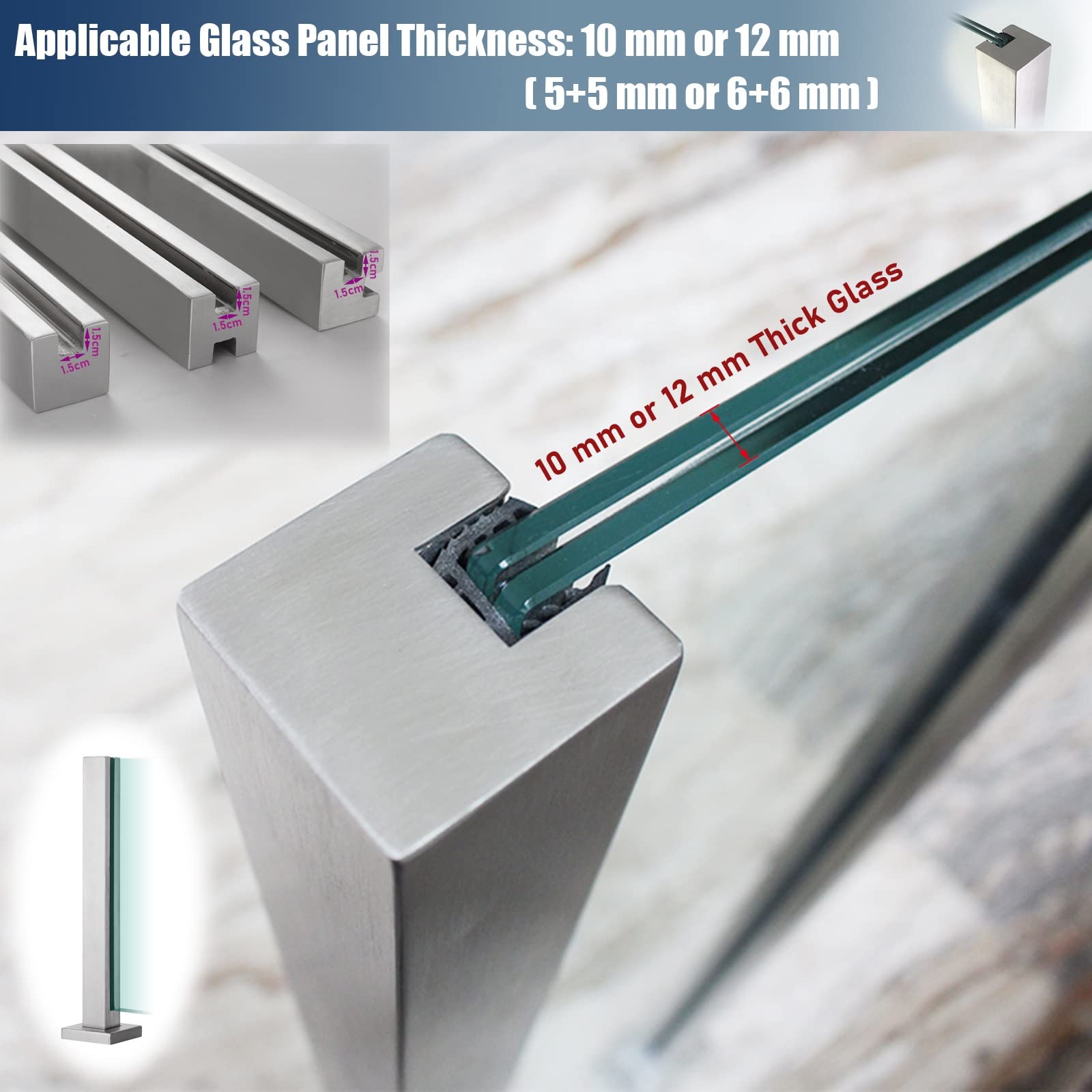 Moderne Eleganz für deine Terrasse! Diese Edelstahl-Glas Geländerpfosten verwandeln deinen Balkon, Terrasse oder Flur in eine stylische Wohlfühloase. Aus hochwertigem Edelstahl 304 gefertigt - rostfrei, witterungsbeständig und für innen und außen geeignet. Die Höhe ist individuell anpassbar von 60-150 cm - maßgeschneidert für dein Projekt! Perfekt für 10-12 mm Einscheibensicherheitsglas oder 5+5mm/6+6mm Verbundglas. Die verdickte Basis (10x10 cm) sorgt für maximale Stabilität, die abgerundeten Ecken für Sicherheit. Ohne oberen Handlauf genießt du freie Sicht - modern und luftig! Einfache Montage: Glas einfach in den Pfostenschlitz stecken, Gummistreifen verhindern Rutschen. Maximale Spannweite zwischen Pfosten: 120 cm. Im Lieferumfang: 1 Pfosten, 4 Schrauben, Gummistreifen (Glas und Handlauf separat). Ideal für Wohnhäuser, Hotels, Einkaufszentren, Pools - überall wo Sicherheit und Design zählen. Wir helfen bei der Planung - sende uns einfach ein Bild deines Projekts! Erstelle dir deine persönliche Premium-Geländerlösung mit ungehinderter Aussicht. Modern, sicher und absolut stylisch!