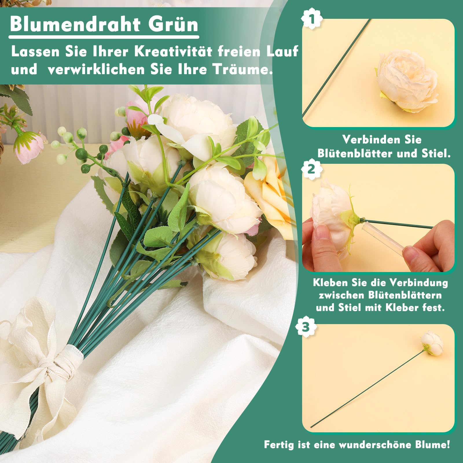 Kreativität kennt keine Grenzen mit diesem Blumendraht-Set! 150 Stück grüner Draht à 30 cm Länge und 2 mm Durchmesser - perfekt für alle Bastelprojekte. Ob frische Blumensträuße binden, Kränze gestalten oder Papierblumen formen - dieser Draht hält alles sicher zusammen. Die grüne Ummantelung sieht natürlich aus und ist wasserfest sowie rostfrei. Einfach mit der Hand zu biegen und zu schneiden - kein Werkzeug nötig! Ideal für Floristen, Hobby-Bastler oder Schulprojekte. Auch super zum Verlängern von kurzen Blumenstielen oder zum Fixieren von Dekorationen. Mit diesem Draht werden deine Blumenarrangements zum echten Hingucker! Sofort einsatzbereit - einfach die Box öffnen und loslegen!
