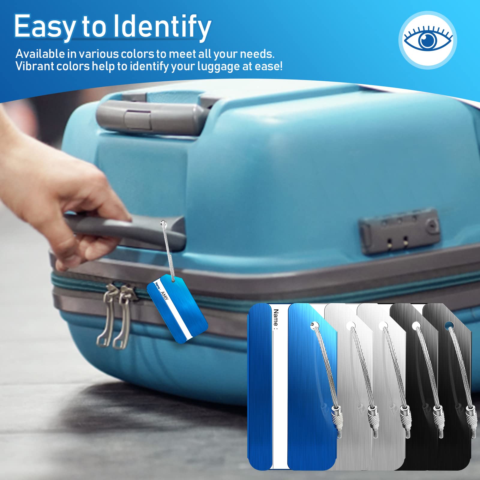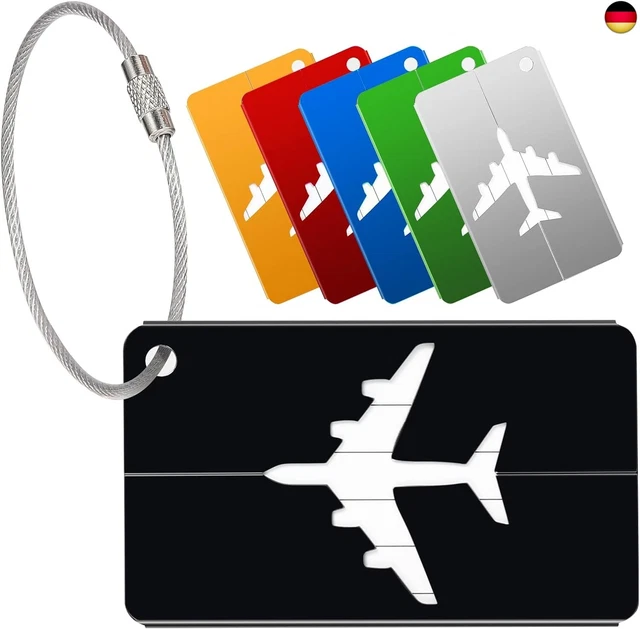 Nie wieder Gepäckverwechslungen! Dieses 6er-Set bunter Kofferanhänger aus Aluminium macht deine Koffer und Taschen unverwechselbar. In 6 verschiedenen Farben - rot, blau, schwarz, orange, silber und grün - findest du dein Gepäck sofort wieder. \\n\\nJeder Anhänger bietet: \\n• Maße: 8x4 cm \\n• Robuste Edelstahl-Drahtschlaufe \\n• Wasserdichtes Aluminium-Gehäuse \\n• Austauschbares Namensschild \\n• Einfache Befestigung an allen Griffen \\n\\nSo funktioniert's: \\n1. Deine Kontaktdaten auf die mitgelieferte Karte schreiben \\n2. Karte in den Anhänger stecken \\n3. Mit der Drahtschlaufe am Gepäck befestigen \\n4. Fertig - dein Gepäck ist persönlich markiert! \\n\\nDie wasserdichten Eigenschaften schützen deine Daten vor Regen und Spritzwasser. Gleichzeitig bleibt deine Privatsphäre gewahrt - nur dein Name ist sichtbar, Adresse und Telefonnummer bleiben geschützt. \\n\\nPerfekt für: \\n• Flugreisen und Urlaub \\n• Geschäftsreisen \\n• Rucksack-Touren \\n• Kinderwagen und Sporttaschen \\n• Haustiertransporter \\n\\nMit diesem Set hast du für die ganze Familie genug Anhänger - und jeder kann sich seine Lieblingsfarbe aussuchen!