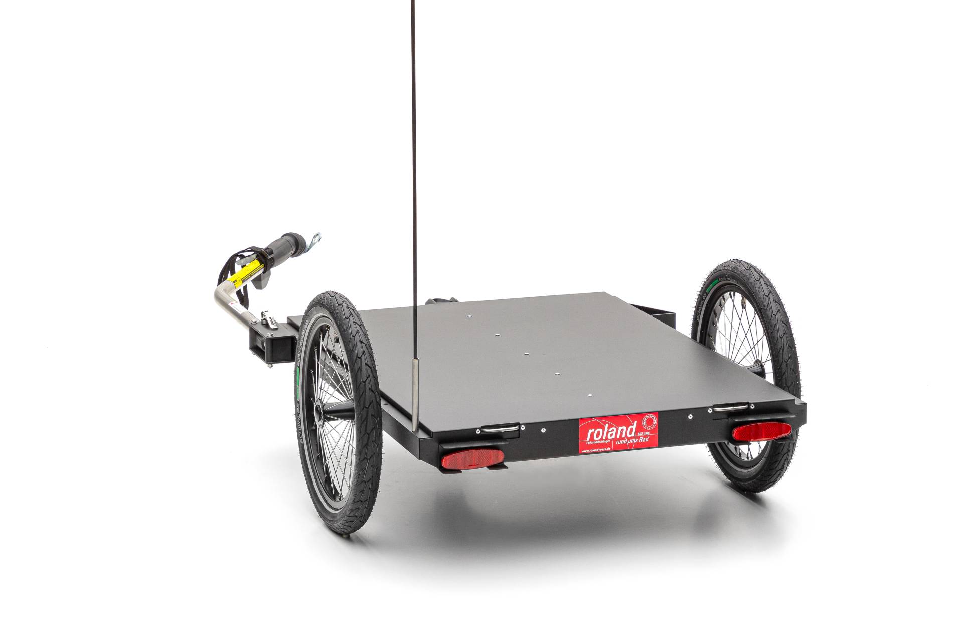 Der ROLAND Jumbo - dein zuverlässiger Begleiter für große Transporte! Dieser robuste Fahrradanhänger 'Made in Germany' überzeugt mit seiner Birkenholz-Transportbox und stabilen Stahlrohrkonstruktion. Mit 20-Zoll-Speichenrädern und höhenverstellbarer Tiefdeichsel mit WEBER E-Kupplung passt er an die meisten Fahrradtypen. Der integrierte Federstützfuß erleichtert das Be- und Entladen. Witterungsbeständig, schlagfest und mit Aluminium-Kantenprofilen geschützt. 8 Reflektoren sorgen für Sicherheit bei Dunkelheit. Handgefertigte Qualität für jahrelangen zuverlässigen Einsatz!