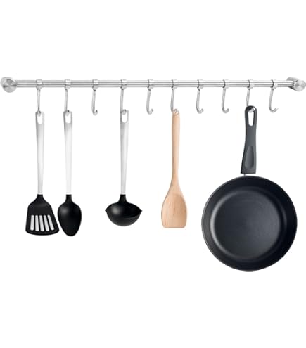Boah, dieses Hängeregale ist ja mal der absolute Game-Changer für deine Küche! Aus hochwertigem 304er Edelstahl - rostfrei, geruchlos und super pflegeleicht. Mit 12 abnehmbaren Haken kannst du alles aufhängen, was dir in die Hände fällt: Töpfe, Pfannen, Kochlöffel, aber auch Handtücher oder sogar Mäntel.\n\nDas coole Feature: Der Abstand zwischen Stange und Wand beträgt 4 cm - perfekt um auch Topfdeckel platzsparend unterzubringen. Die Haken sind beweglich, du kannst sie also ganz nach Bedarf anordnen. Und die Tragkraft von ca. 20 kg ist echt beeindruckend!\n\nMontage? Kinderleicht! Einfach an die Wand schrauben oder kleben - keine komplizierten Konstruktionen. Ob in der Küche, im Bad, auf dem Balkon oder in der Werkstatt: Dieser Organizer macht überall eine gute Figur. Das gebürstete Nickel-Design sieht dabei noch richtig edel aus. Endlich Ordnung in deinem Zuhause!