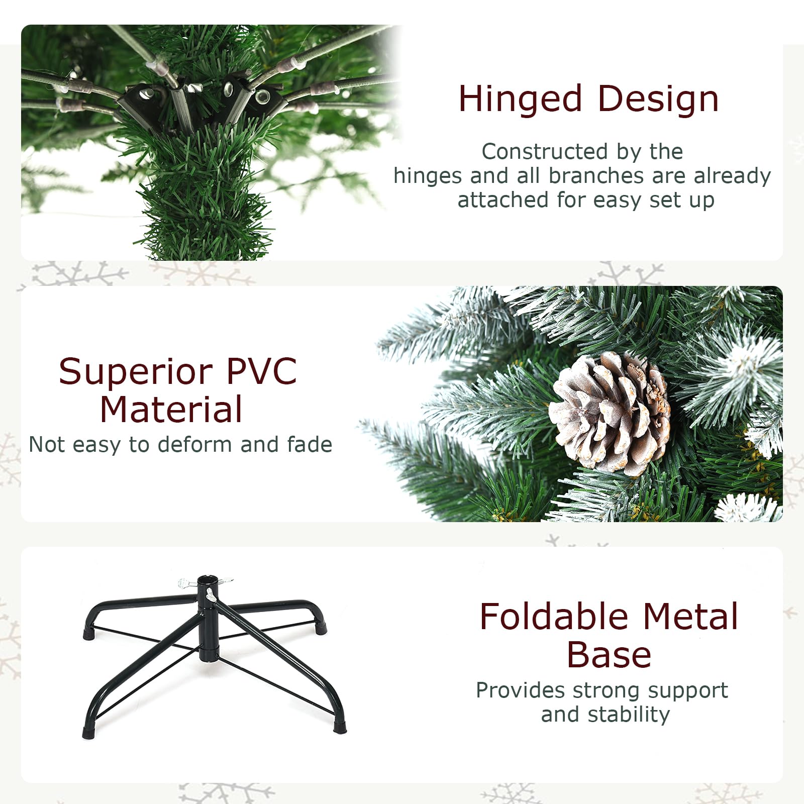 Ein Traum von Weihnachtsbaum! Dieser 220cm hohe künstliche Baum von KOMFOTTEU sieht aus wie echt - mit 720 schneebedeckten Zweigen und 39 realistischen Tannenzapfen. Aus hochwertigem PVC, verblasst nicht und verformt sich nicht. Das schlanke Design ist perfekt für kleine Räume. Mit faltbarem Metallständer der super stabil steht. Du kannst ihn nach Belieben schmücken - mit Kugeln, Lichterkette, was auch immer dir gefällt! Ideal für Wohnung, Büro, Geschäft oder Einkaufszentrum. Nach Weihnachten einfach zusammenklappen und platzsparend verstauen. Mit 5,5kg Gewicht gut zu handhaben. Damit wird Weihnachten garantiert gemütlich!